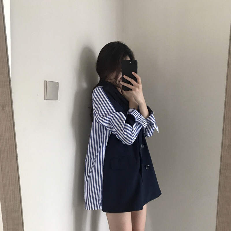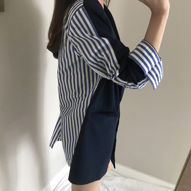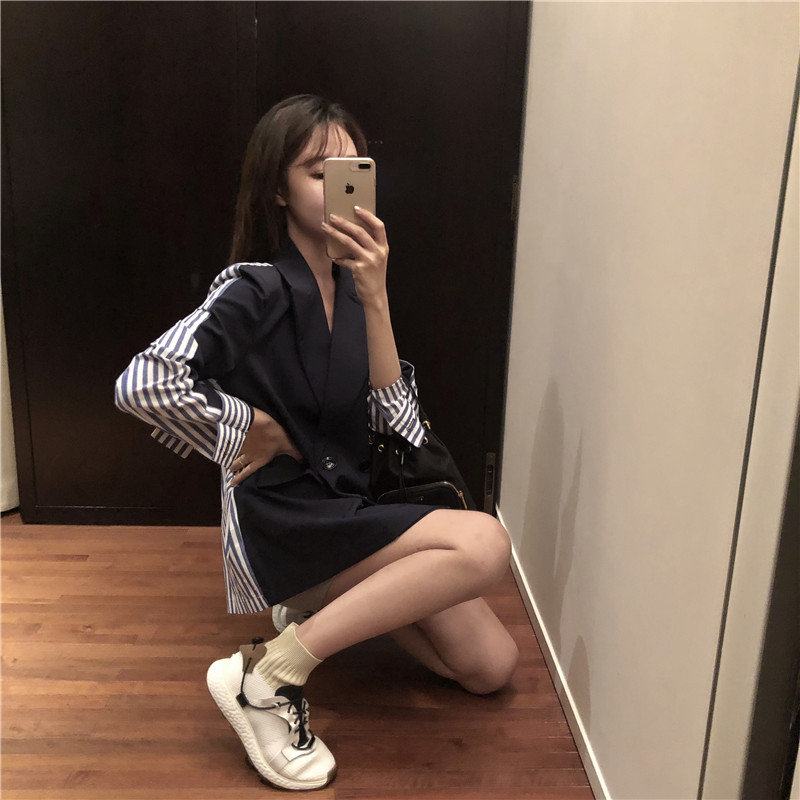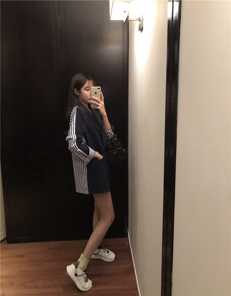 / 2018秋裝新款時尚墊肩設計感寬松外套女拼接條紋西裝中長款小西服