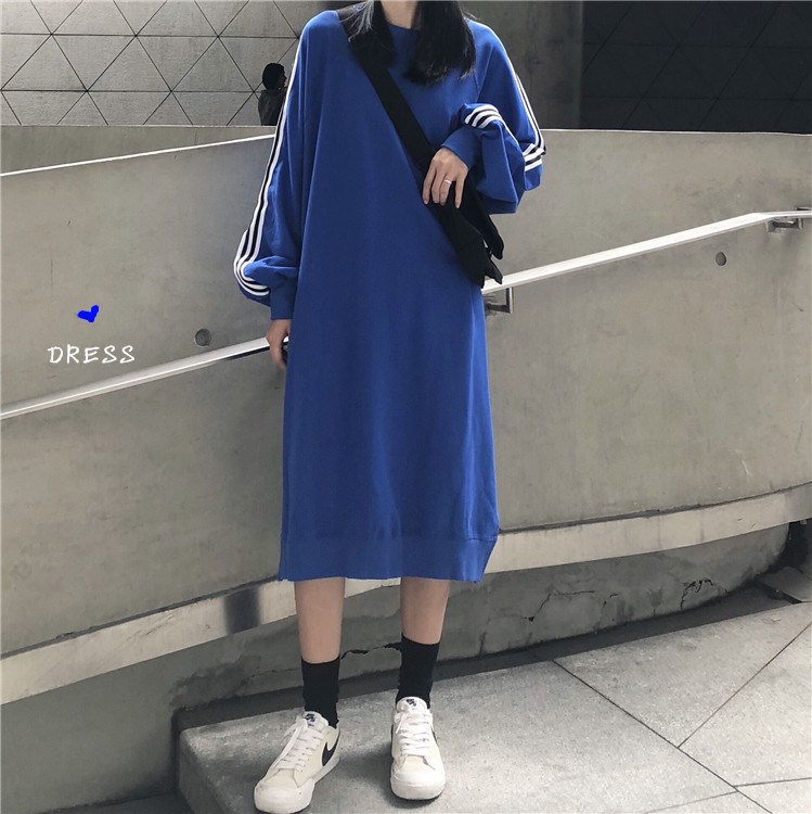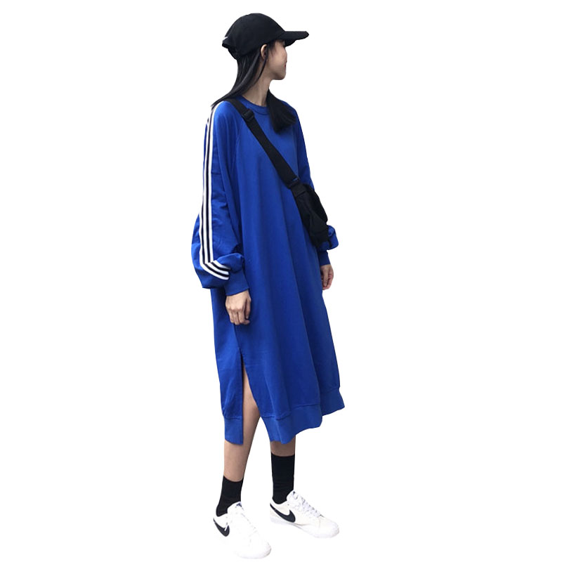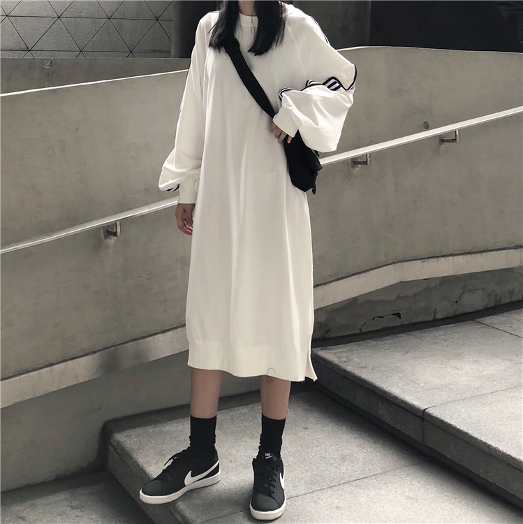 / 秋季女裝韓版中長款慵懶風寬松顯瘦側開叉條紋長袖套頭連衣裙長裙