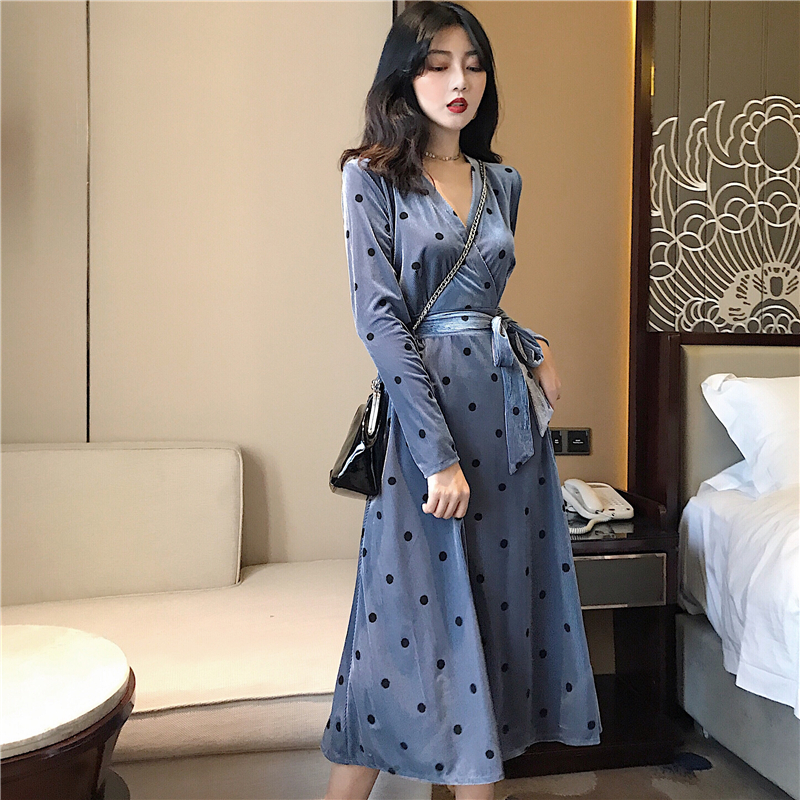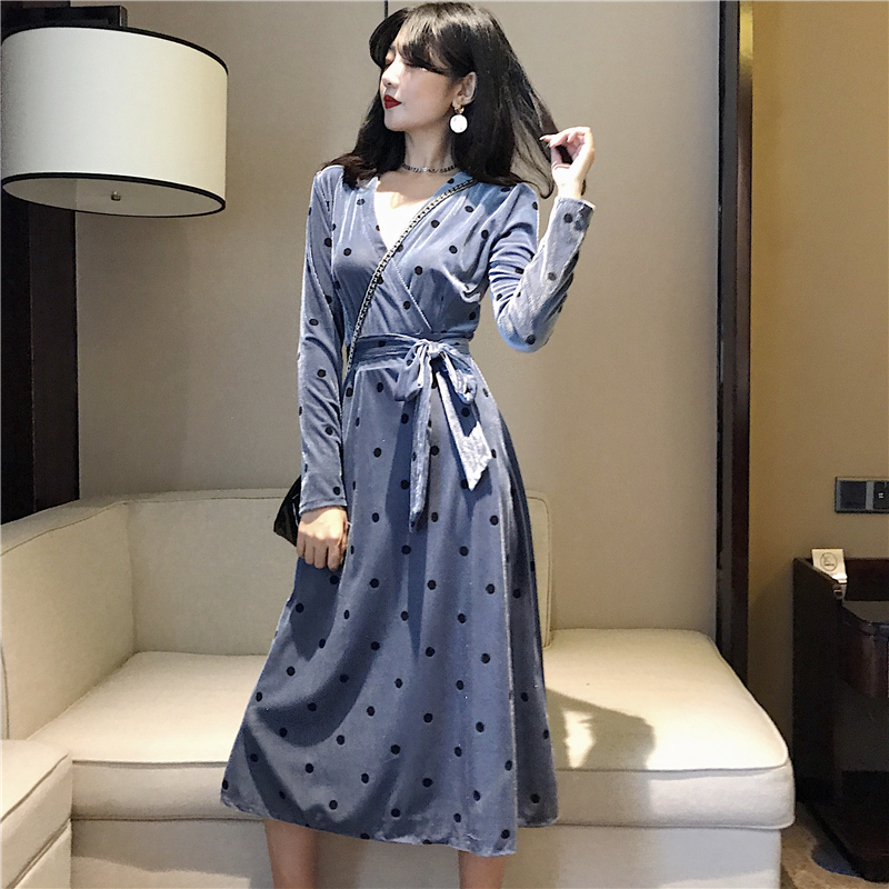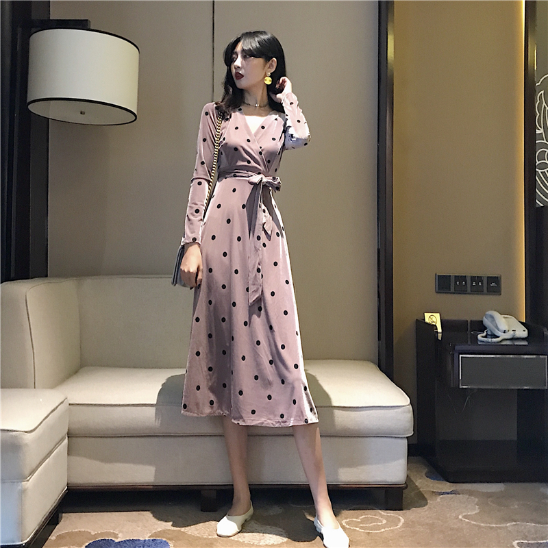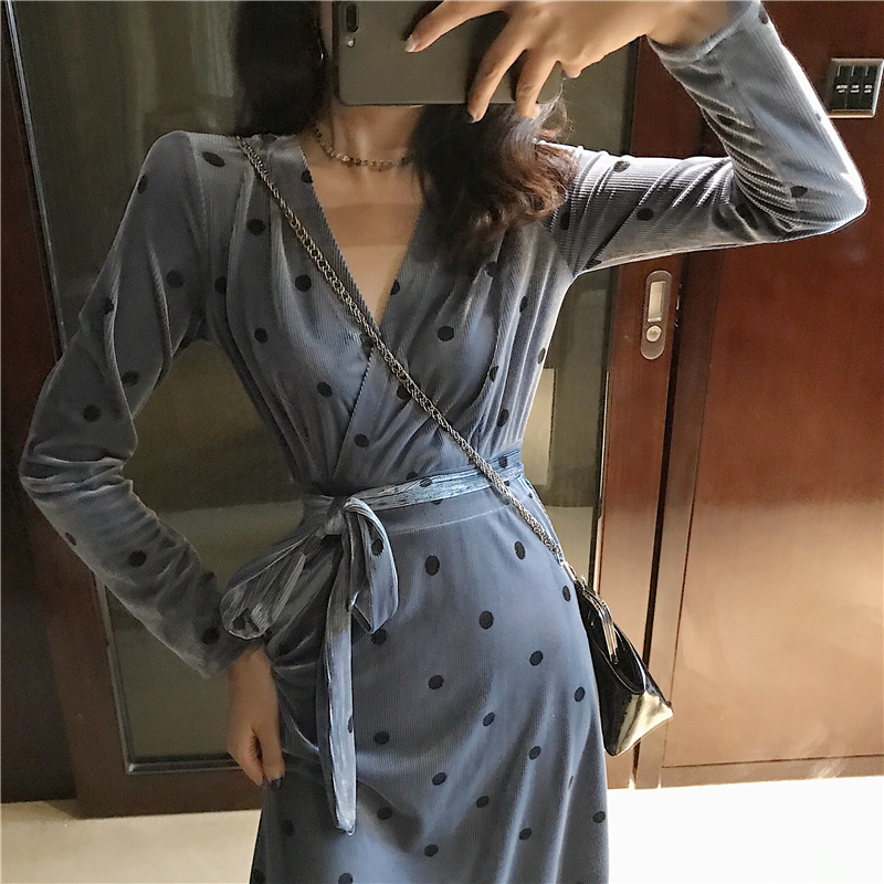 / 晚晚風新款韓版秋季時尚氣質百搭絲絨波點連衣裙綁帶收腰打底裙女
