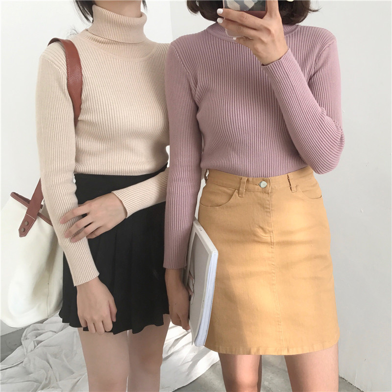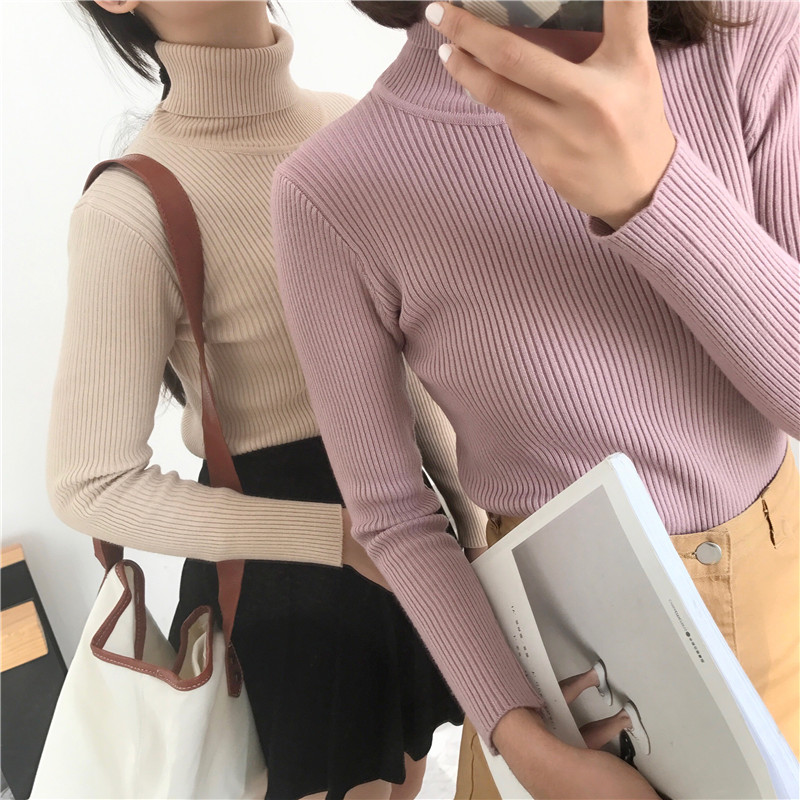 / 秋冬女裝韓版純色軟妹可愛修身顯瘦高領套頭針織衫打底衫毛衣上衣