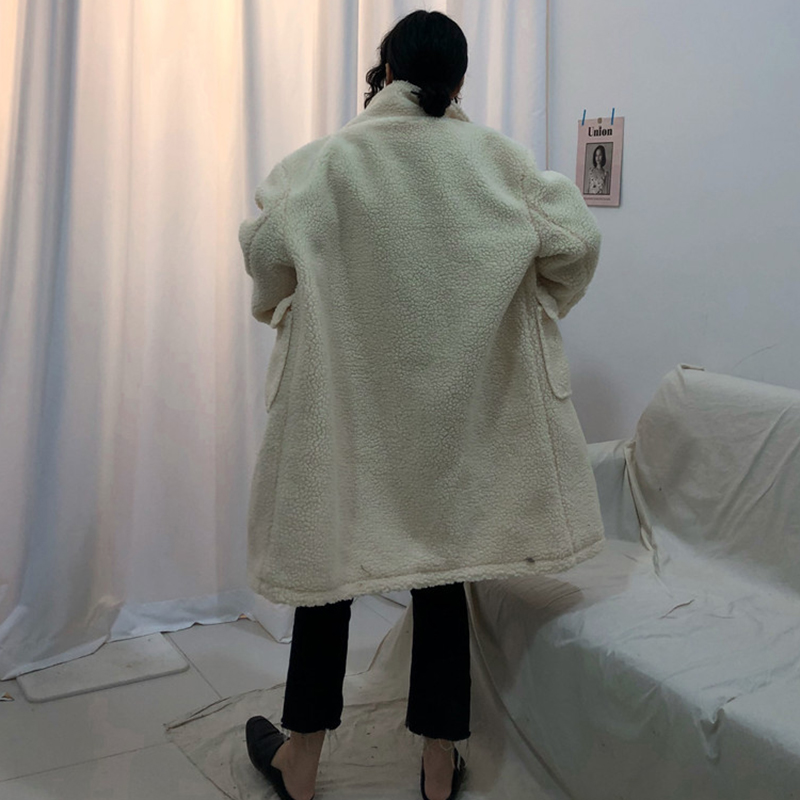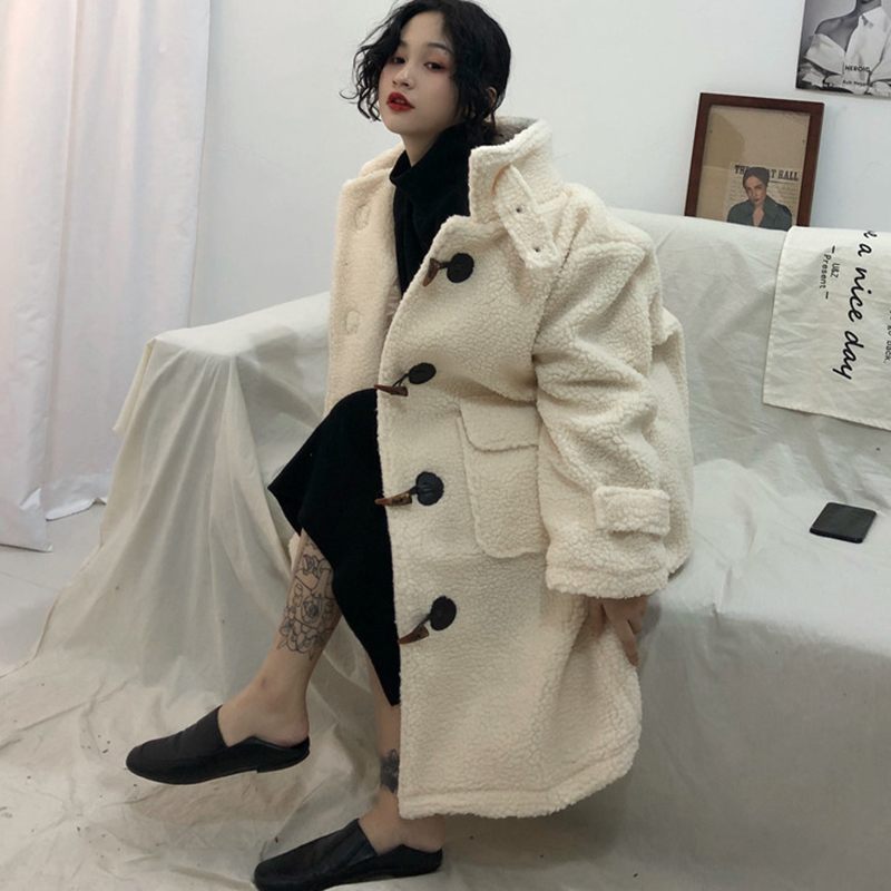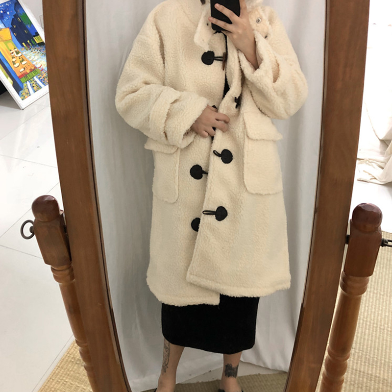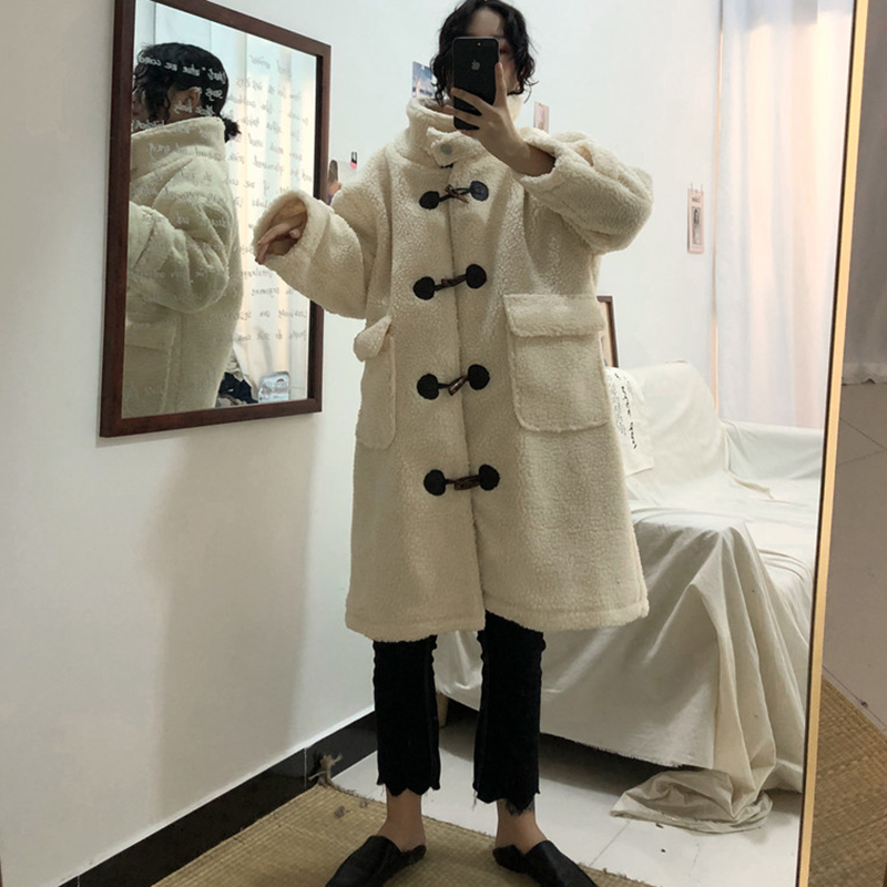 學院風羊羔毛棉衣女秋冬裝2018新款韓版時尚寬松中長款牛角扣外套