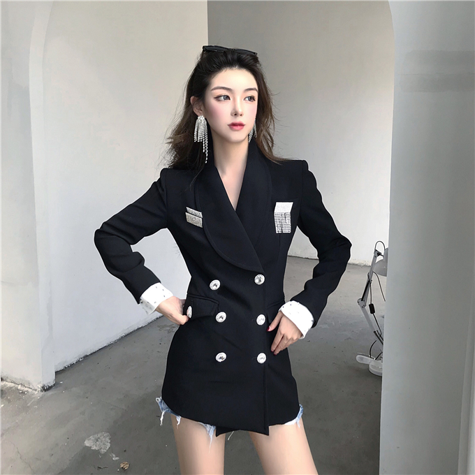 / 黑色亮鉆雙排扣小香風新款韓版修身顯瘦百搭長袖西裝外套女配胸針