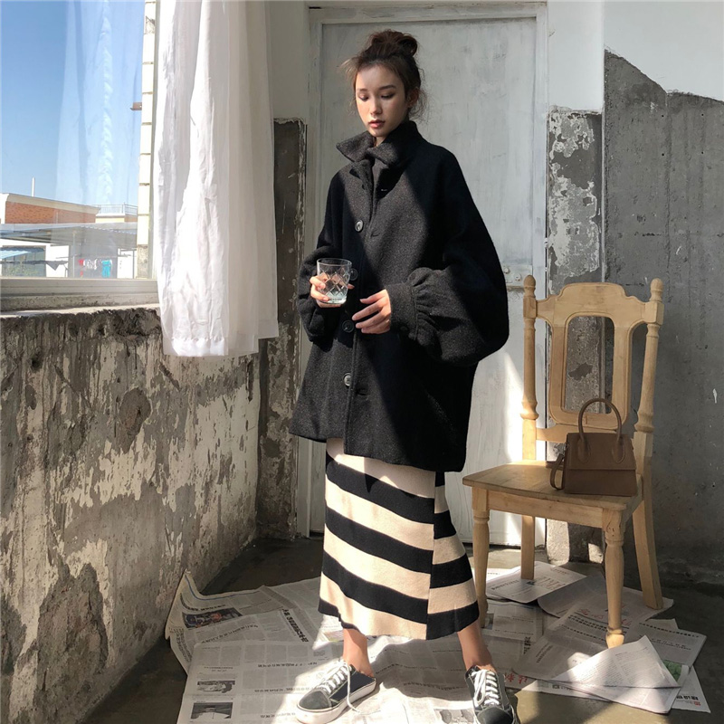 / 2018新款韓版時尚設計感寬松翻領秋冬復古花苞袖毛呢大衣外套女潮