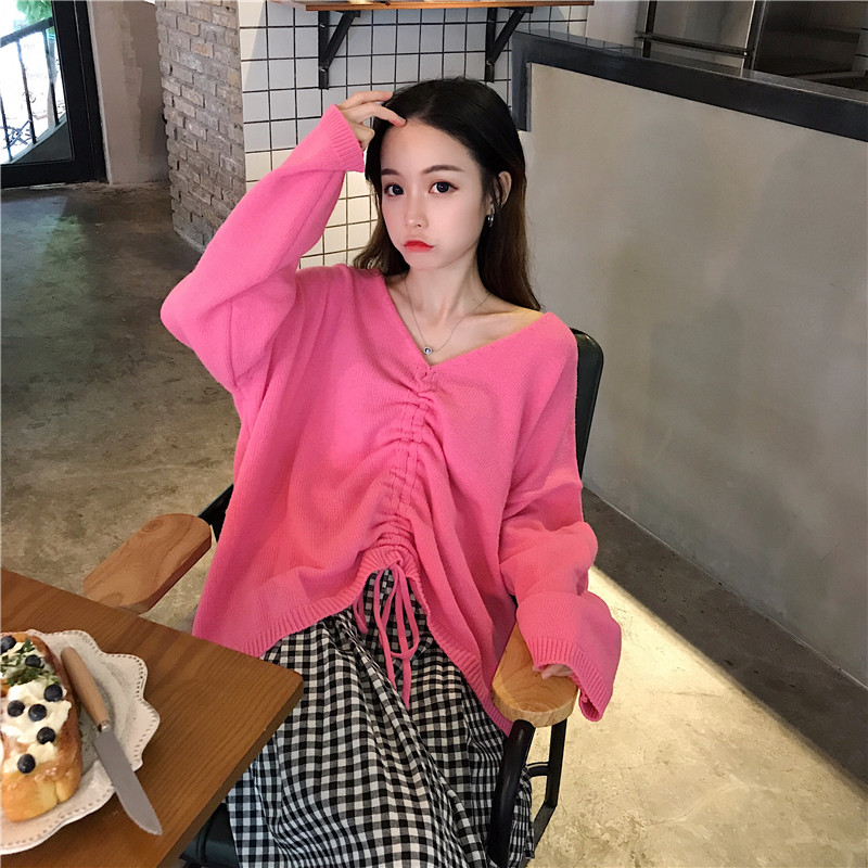 / 秋季韓版中長款慵懶風chic寬松V領網紅套頭針織衫毛衣上衣外套女