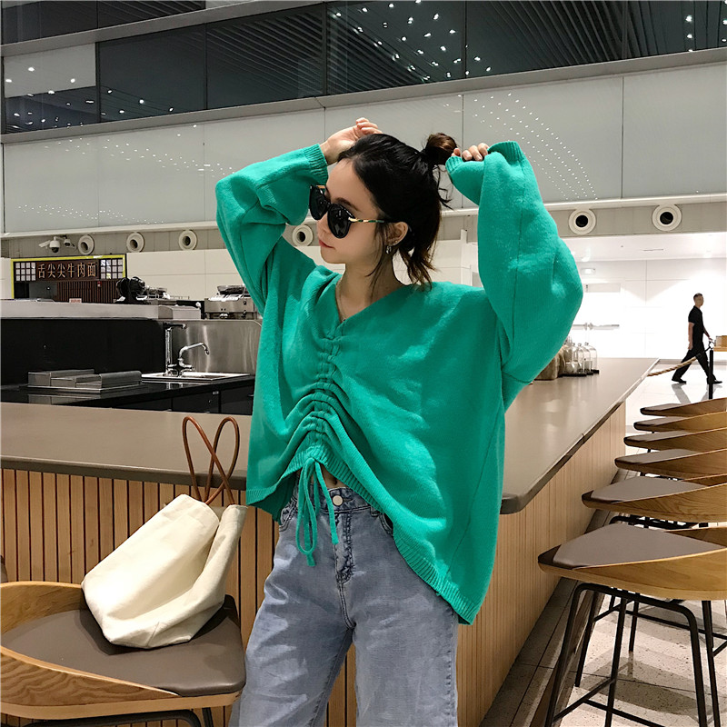 秋季韓版中長款慵懶風chic寬松V領網紅套頭針織衫毛衣上衣外套女