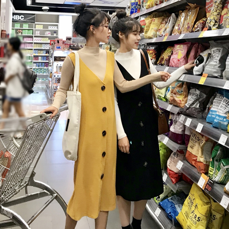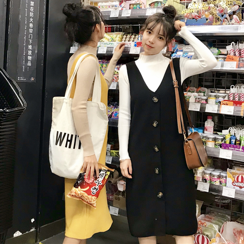 / 兩件套裝女秋新款修身長袖打底針織T恤衫寬松V領中長背心連衣裙子