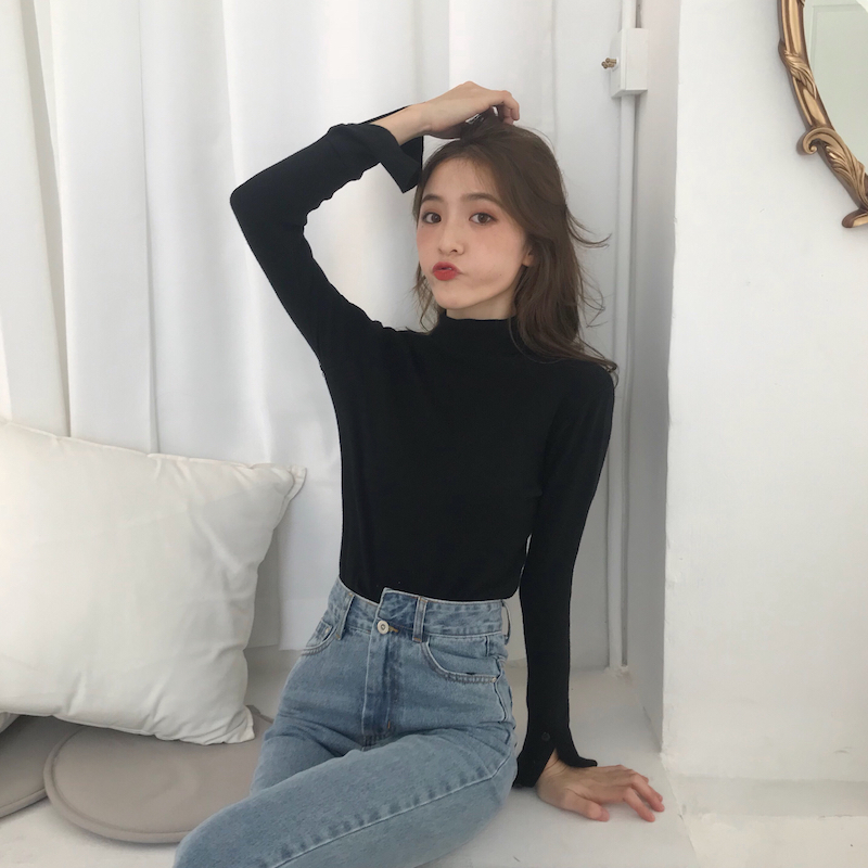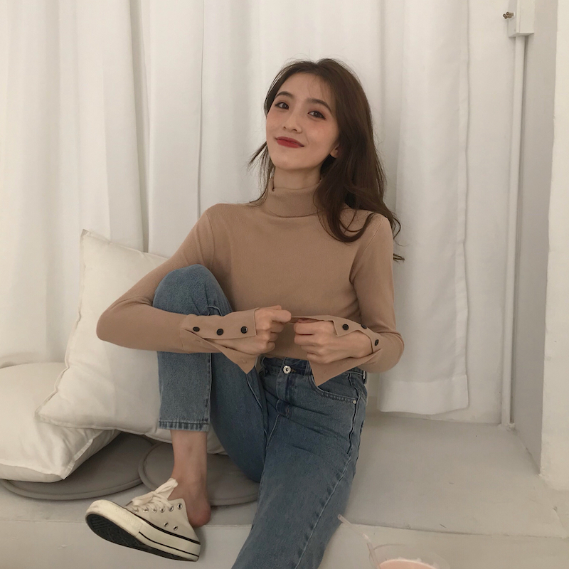 初秋溫柔風毛衣純色半高領紐扣針織衫修身長袖打底套頭加厚女上衣
