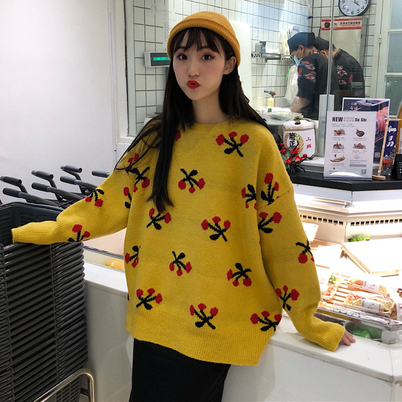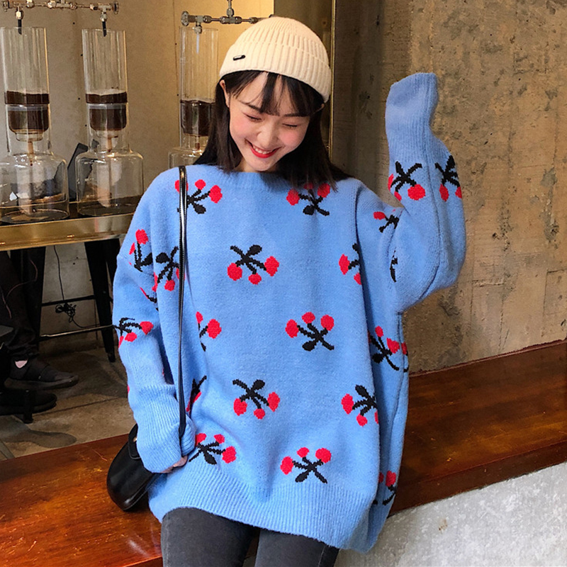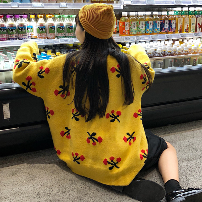 / 小清新毛衣外套女秋冬裝2018新款韓版學生寬松櫻桃提花長袖針織衫