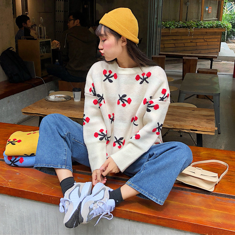 小清新毛衣外套女秋冬裝2018新款韓版學生寬松櫻桃提花長袖針織衫