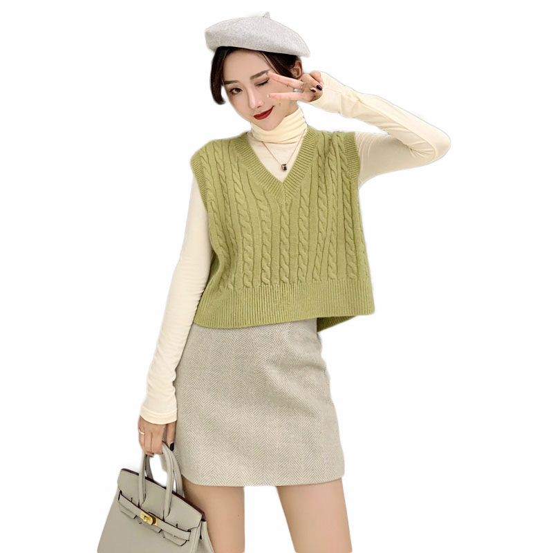 綠色馬甲|杏色打底衫|毛呢半身裙