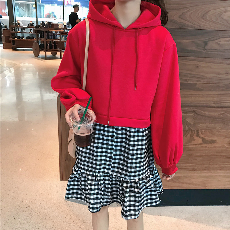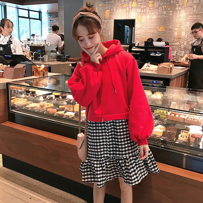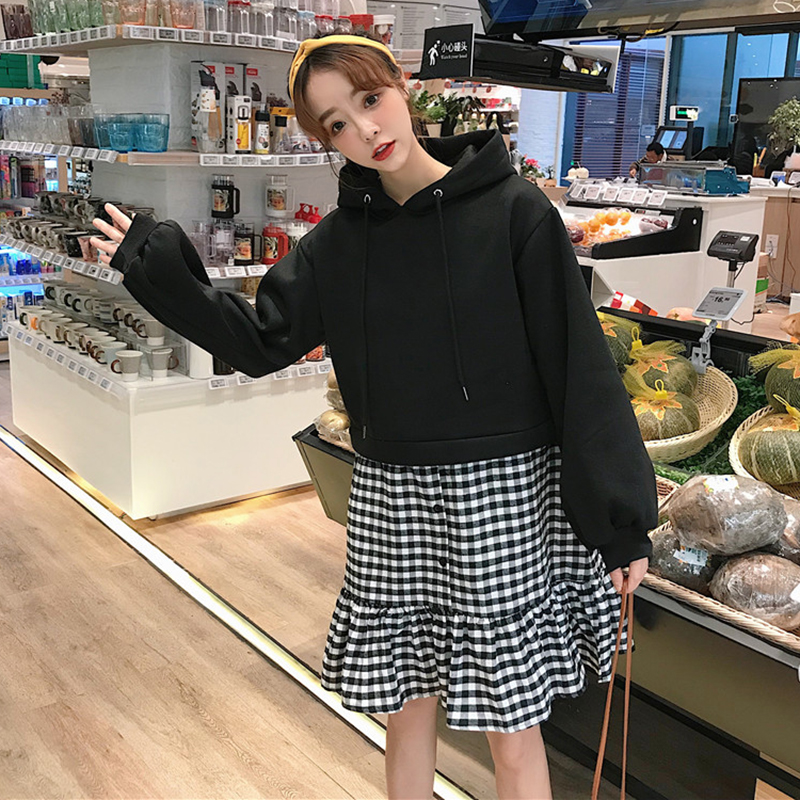 / 時尚加絨連帽衛衣裙女秋冬裝2018新款韓版學生寬松拼接格子連衣裙