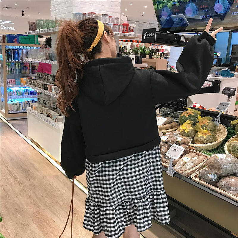 時尚加絨連帽衛衣裙女秋冬裝2018新款韓版學生寬松拼接格子連衣裙