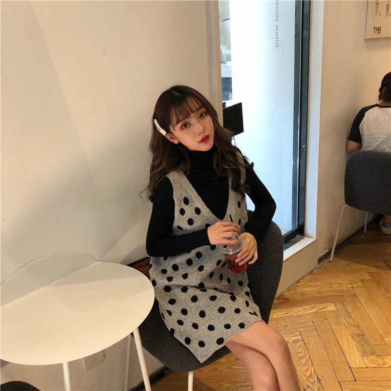 / 韓版時尚休閑套裝秋冬波點V領針織背心裙連衣裙+打底毛衣兩件套女
