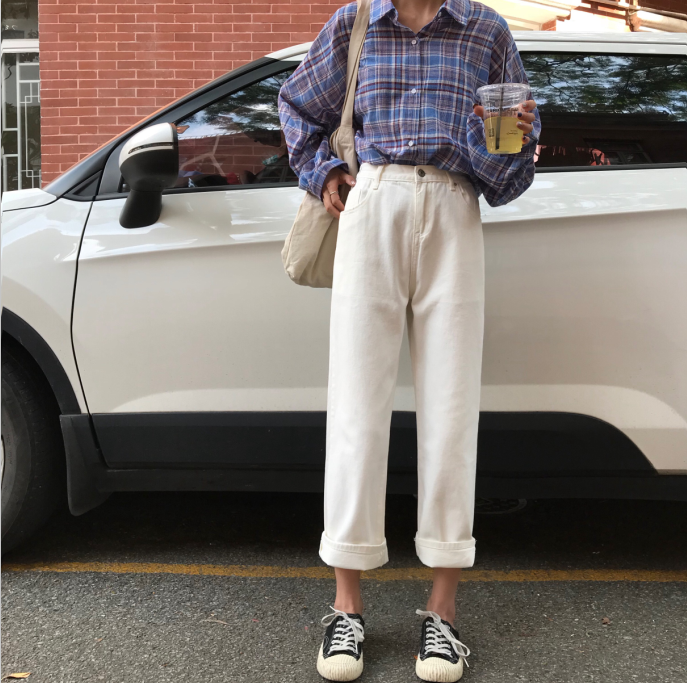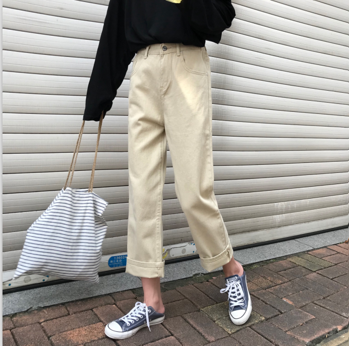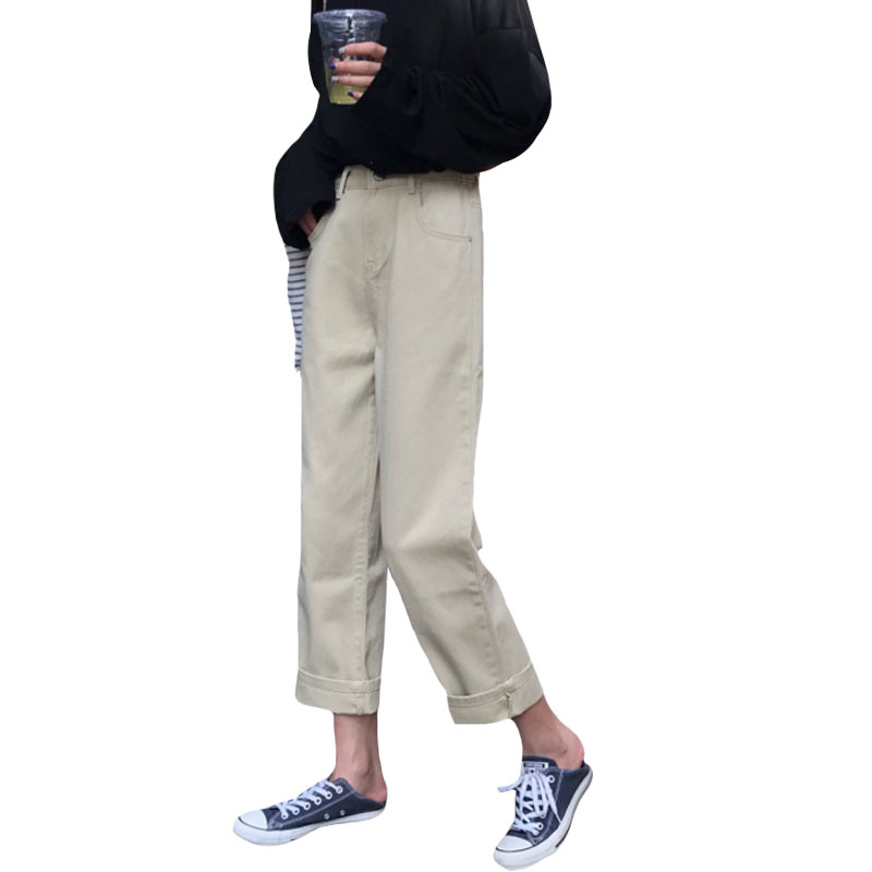 / 秋季女裝韓版復古寬松半松緊腰顯瘦牛仔褲高腰直筒褲闊腿褲九分褲
