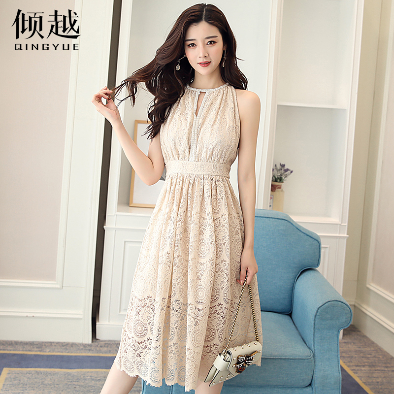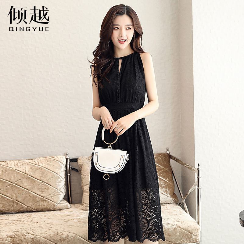 / 蕾絲連衣裙女夏長裙2017新款女裝韓版圓領無袖收腰顯瘦鏤空裙子潮