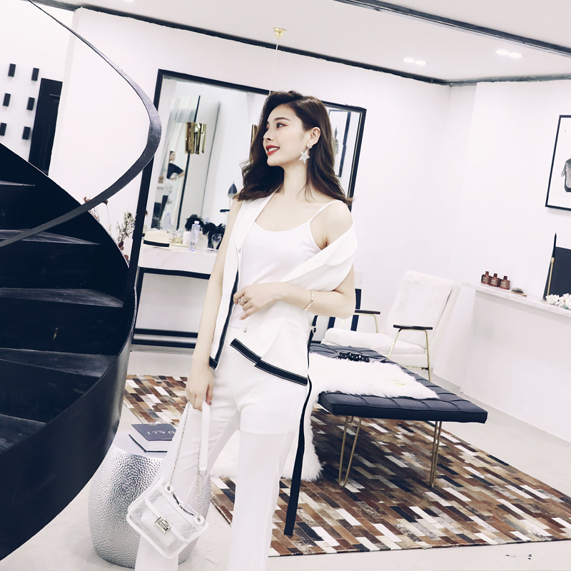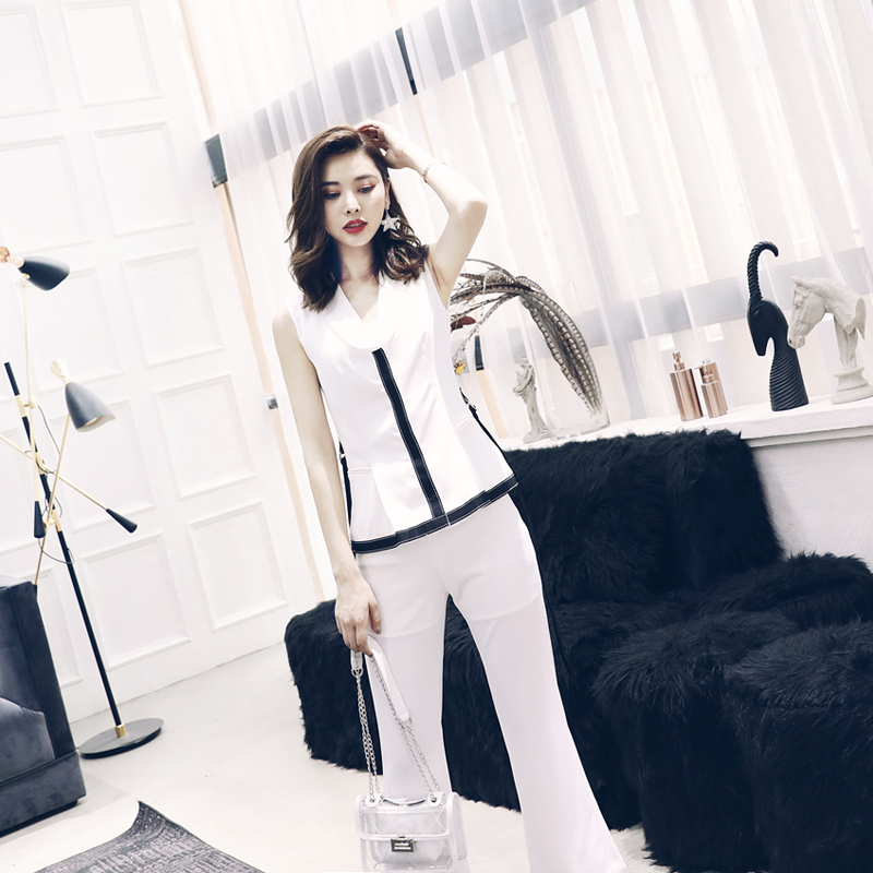 / 2018夏新款女裝兩件套無袖撞色修身馬甲微喇七分褲氣質OL西裝套裝