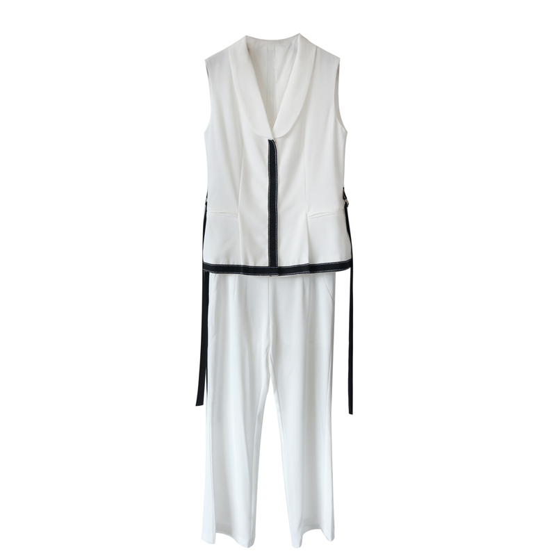 2018夏新款女裝兩件套無袖撞色修身馬甲微喇七分褲氣質OL西裝套裝