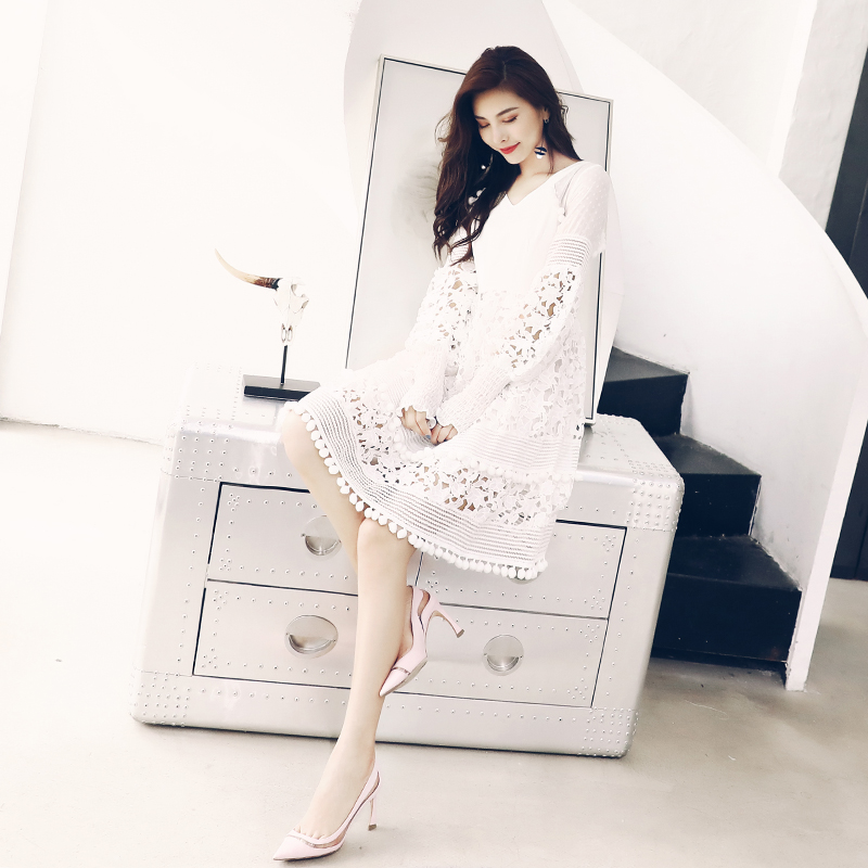 女秋2018新款連衣裙顯瘦初戀裙拼接鏤空白色溫柔風超仙度假裙子潮
