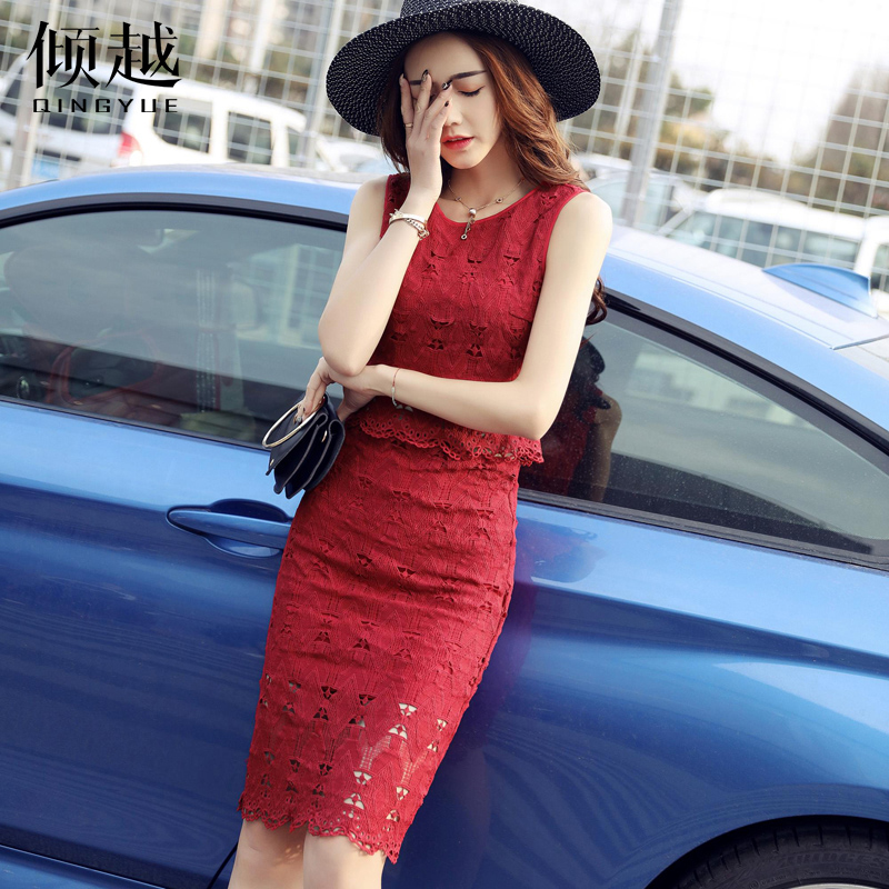 蕾絲連衣裙潮2017夏季新款韓版女裝無袖包臀時尚套裝裙休閑兩件套