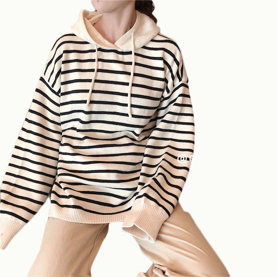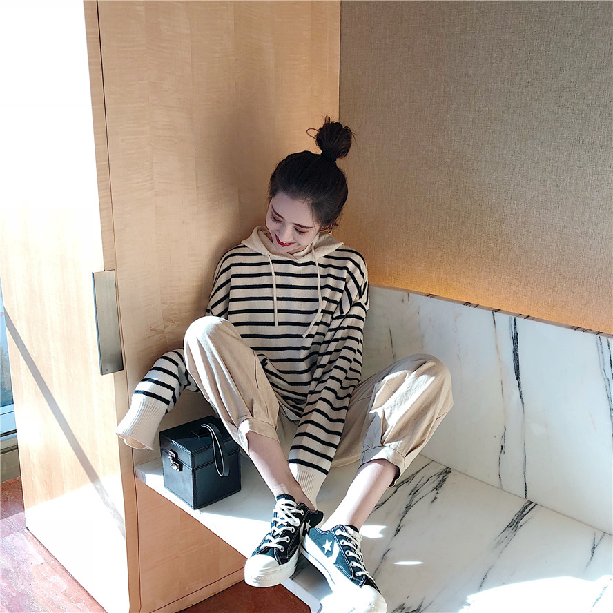 秋裝女2018新款軟糯連帽條紋毛衣女+慵懶風舒適闊腿褲(加厚版)