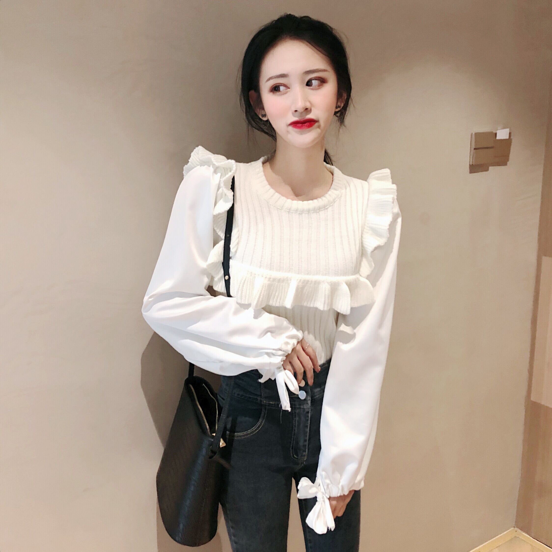 網紅款2018新款秋慵懶風毛衣女長袖拼接荷葉邊圓領假兩件針織衫潮