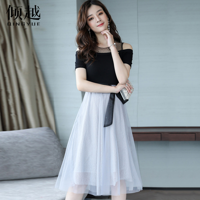 / 連衣裙女夏2017新款韓版時尚修身紗網拼接圓領條紋漏肩短袖中長裙