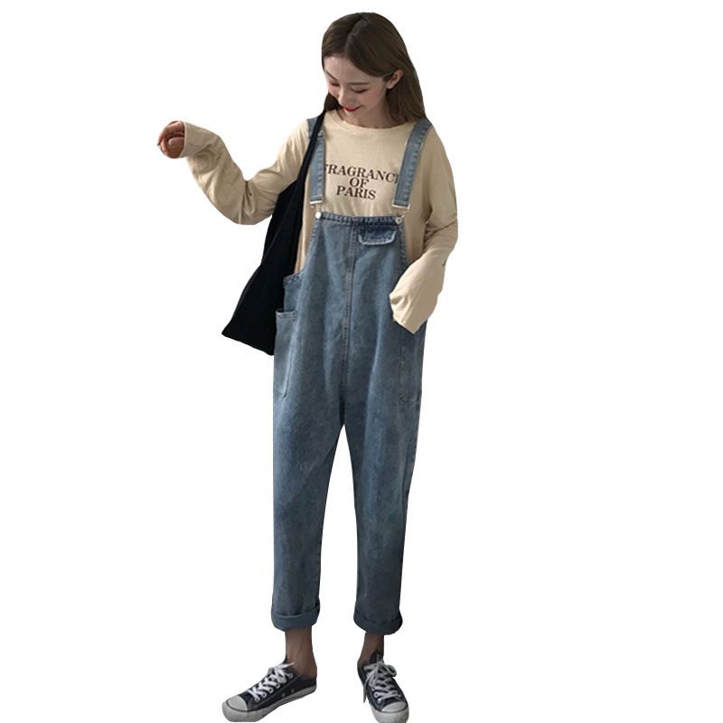 / 秋裝女裝韓版寬松做舊個性背帶牛仔褲高腰顯瘦闊腿褲九分褲直筒褲