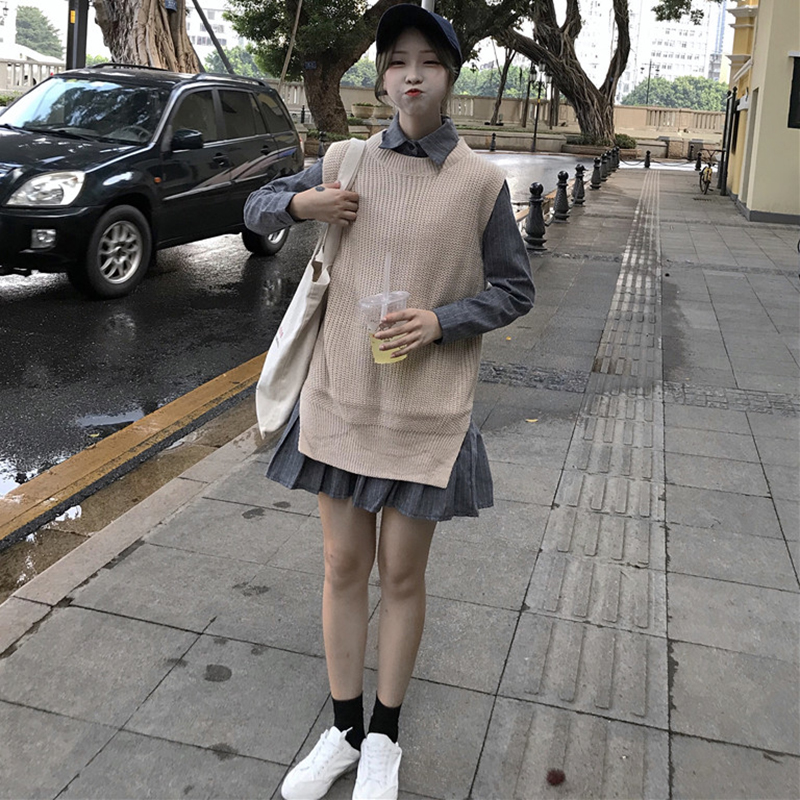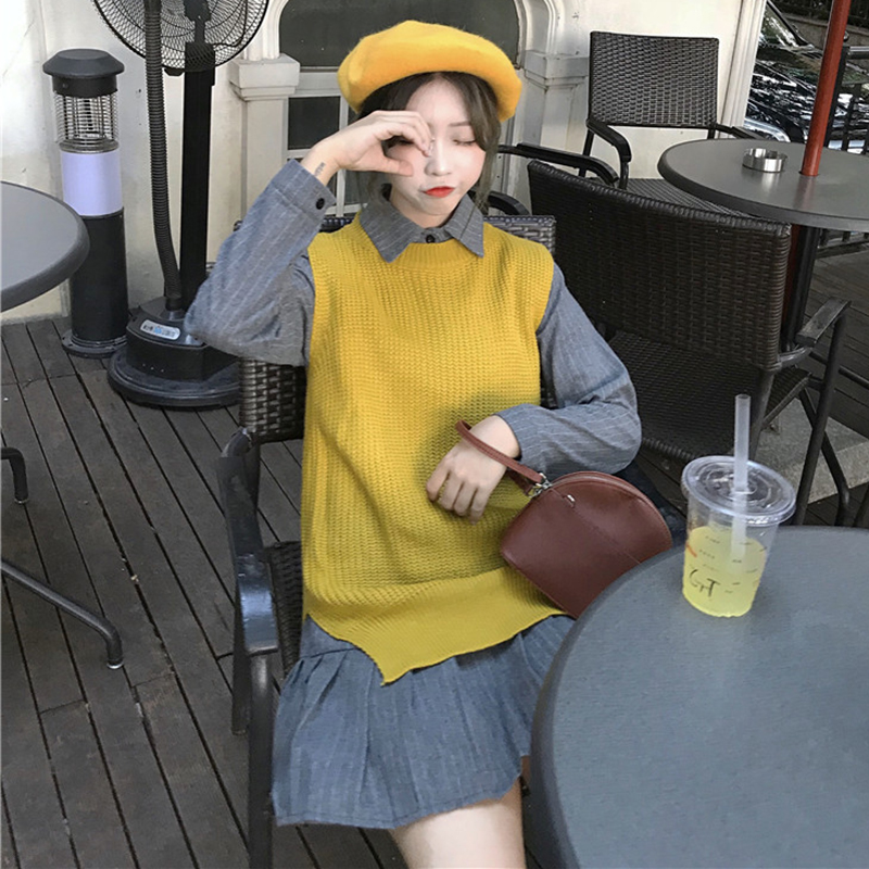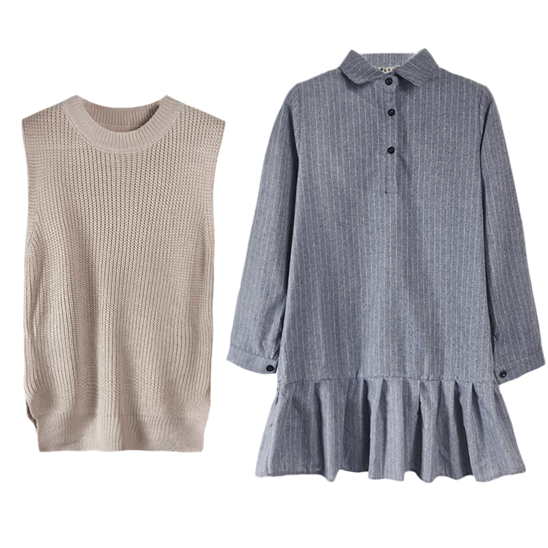 / 秋裝女新款韓版修身條紋襯衣領長袖打底連衣裙+外搭毛衣馬甲套裝
