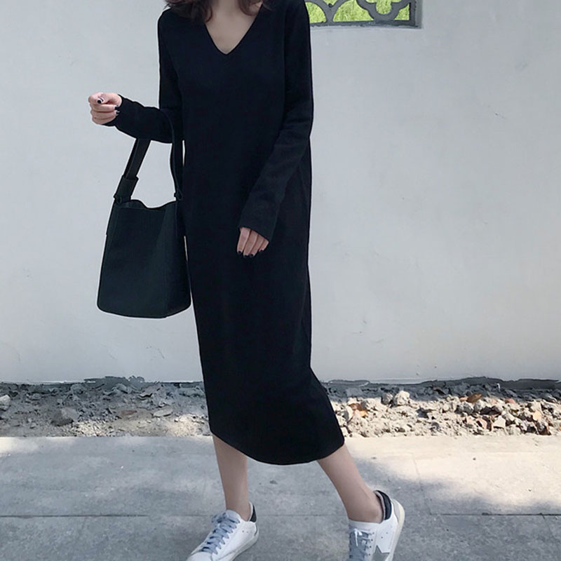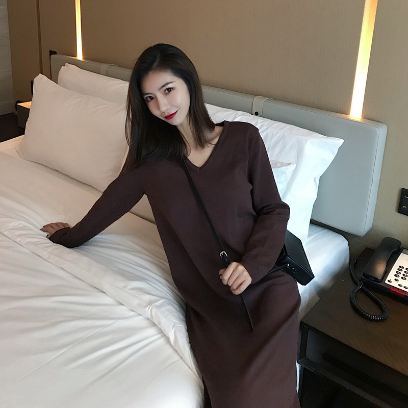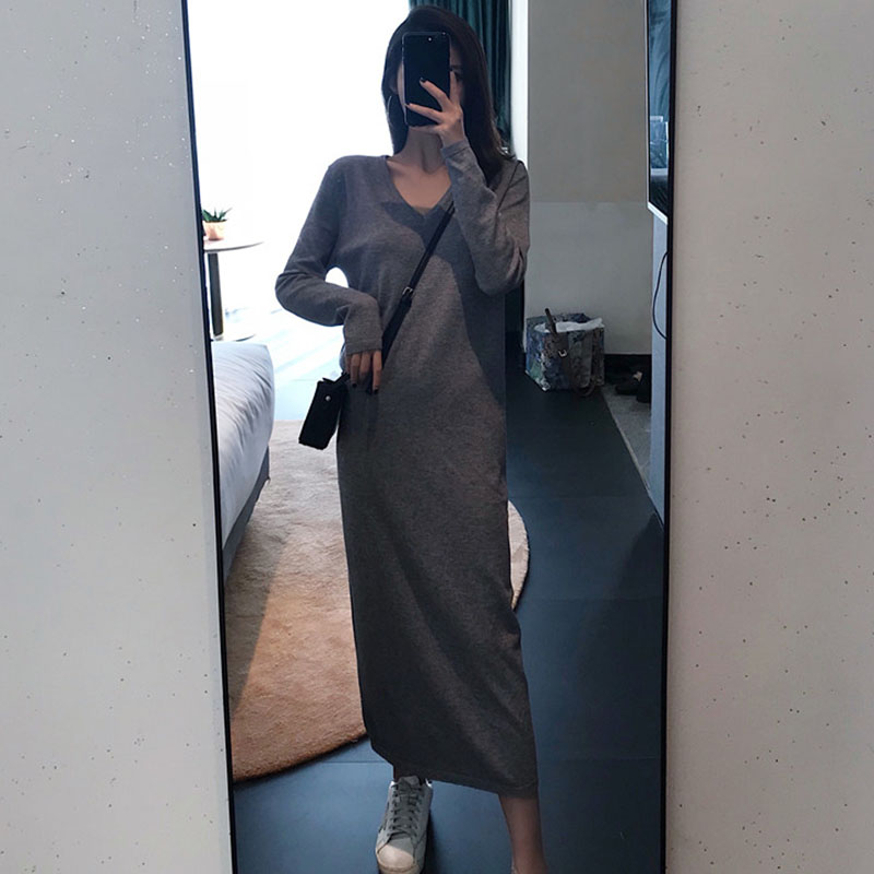 / chic早秋毛衣慵懶風針織衫韓版氣質V領中長款寬松針織打底連衣裙