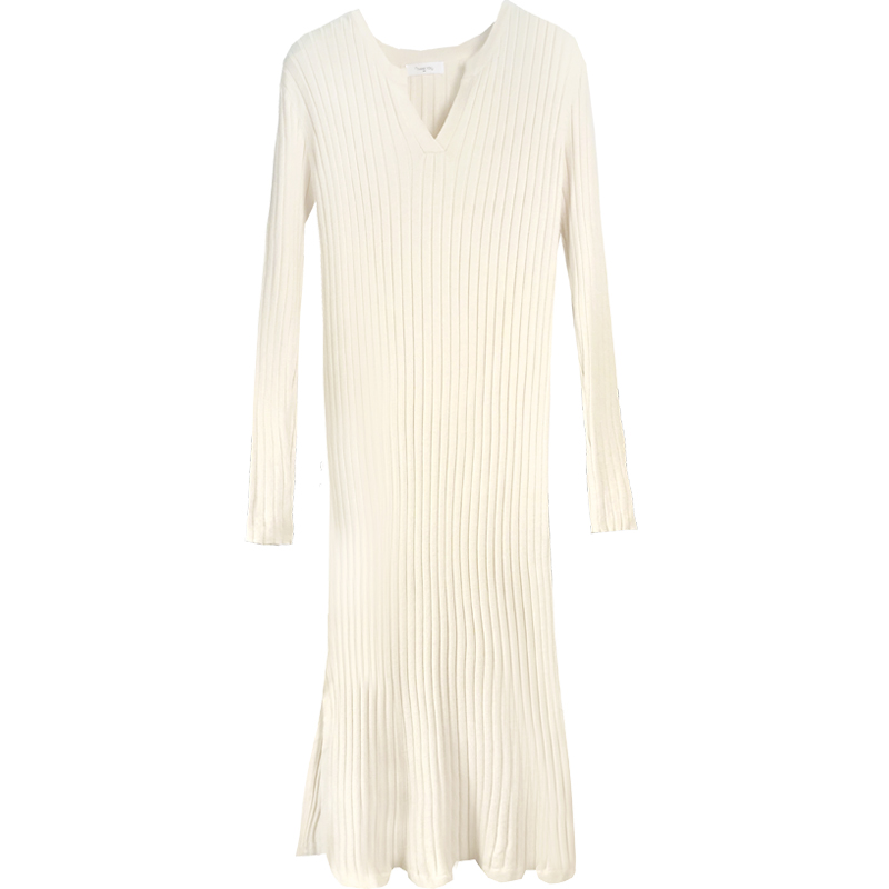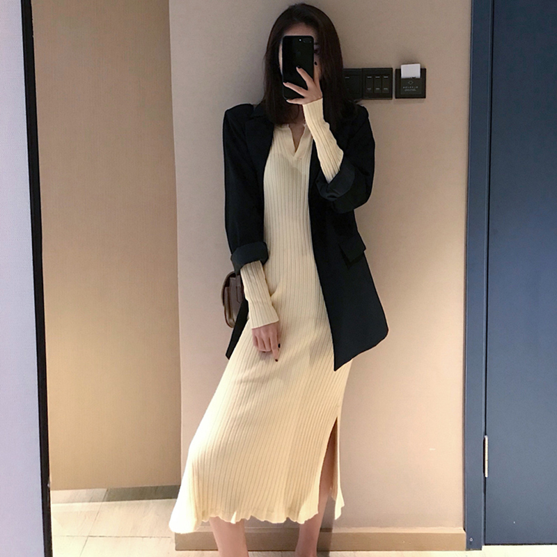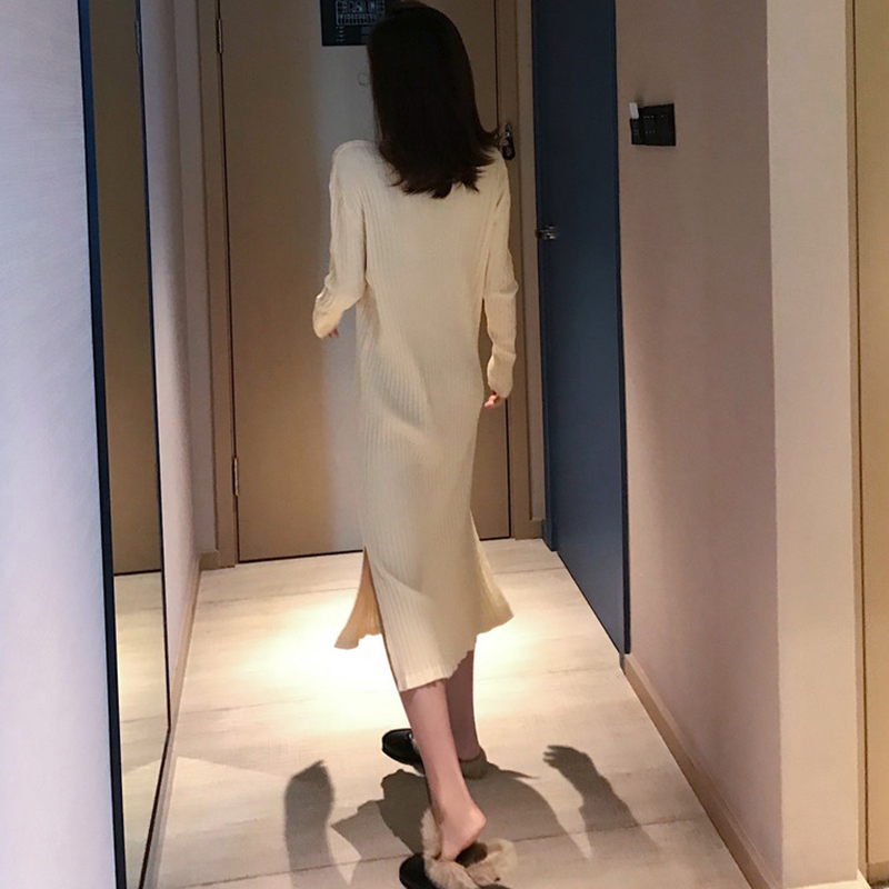 休閑針織長裙女秋裝2018新款韓版寬松開叉連衣裙學生長袖小黑裙子