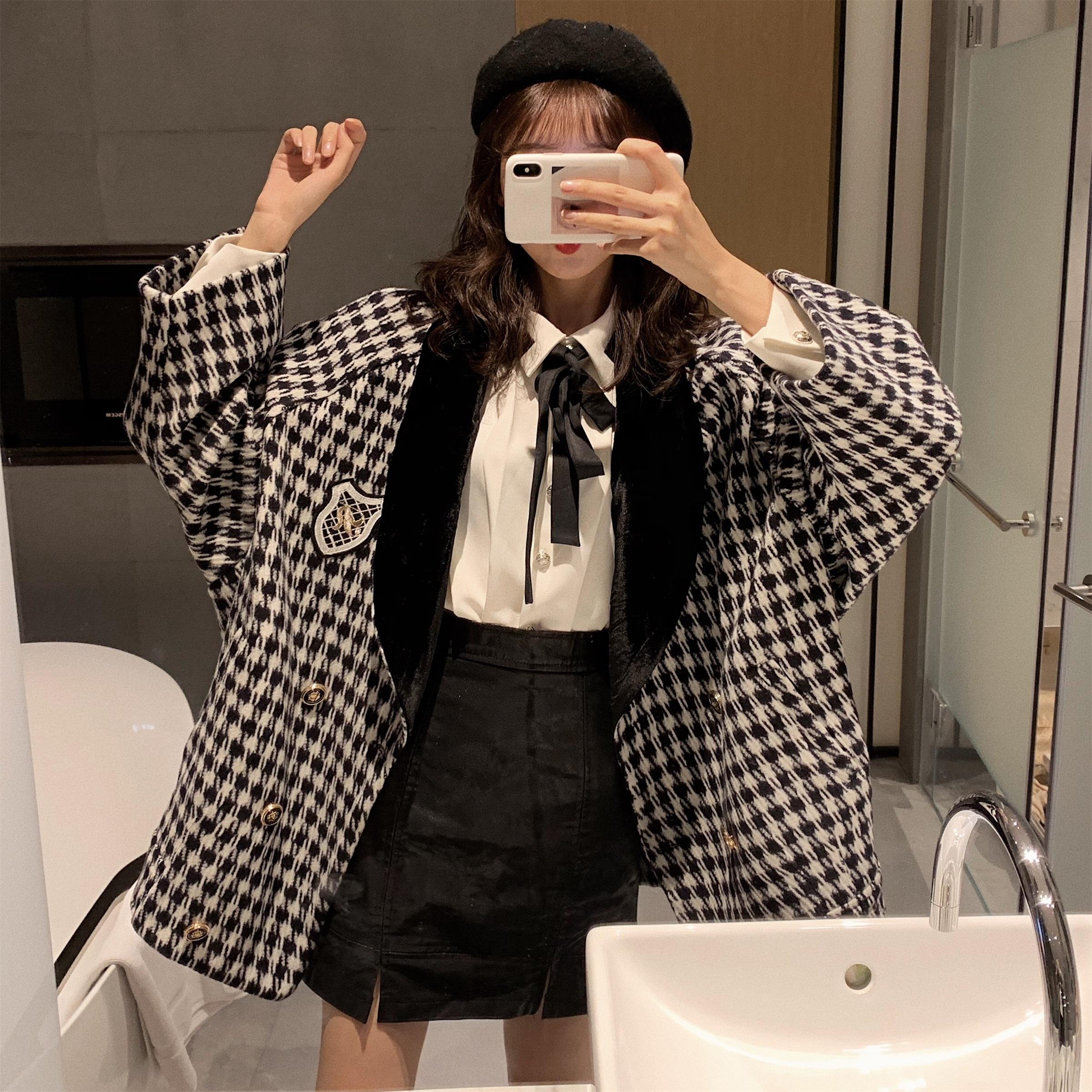 冬季新款寬松斗篷千鳥格毛呢大衣外套女領帶長袖襯衫港風時尚套裝