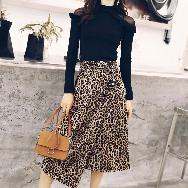 裙子女2018新款不規則半身裙高腰秋冬豹紋百搭中裙時尚針織衫套裝