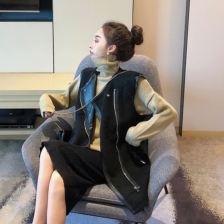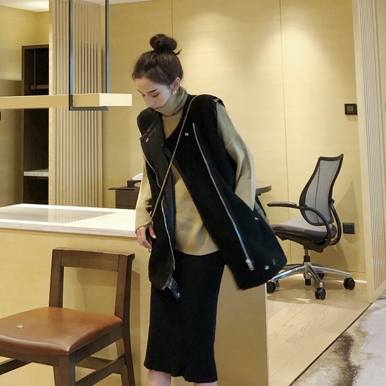 復古風百搭機車時尚套裝復合皮衣夾克外套高領針織衫毛衣兩件套女