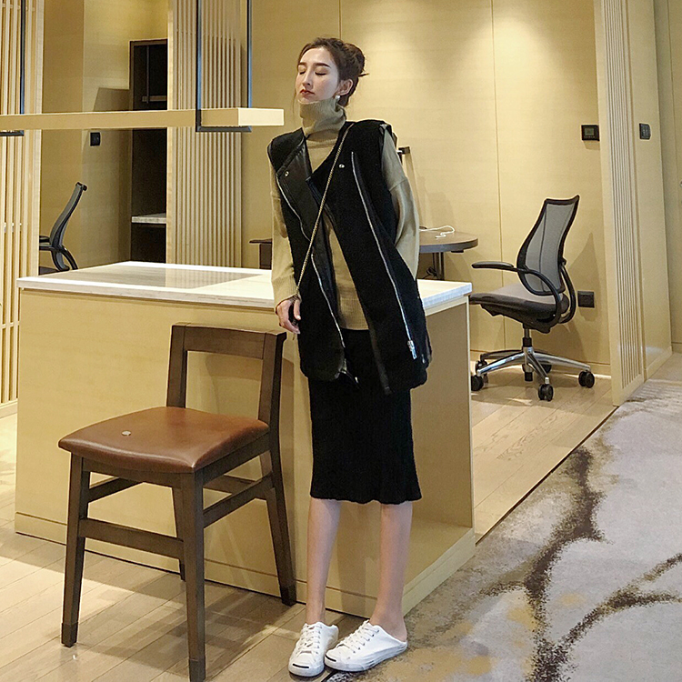 / 復古風百搭機車時尚套裝復合皮衣夾克外套高領針織衫毛衣兩件套女