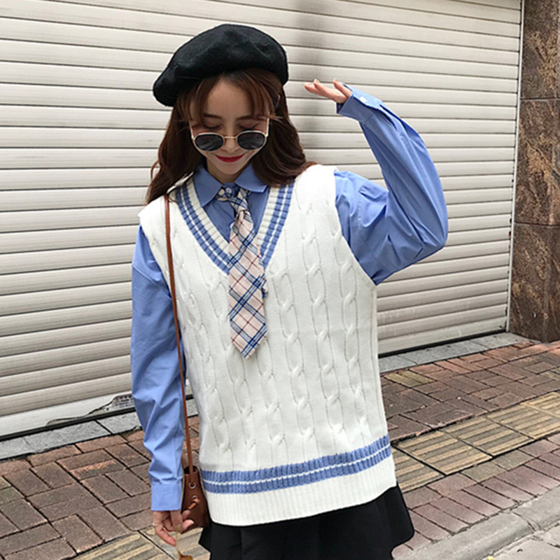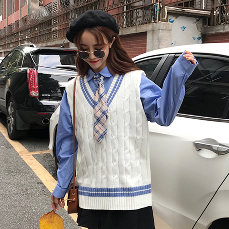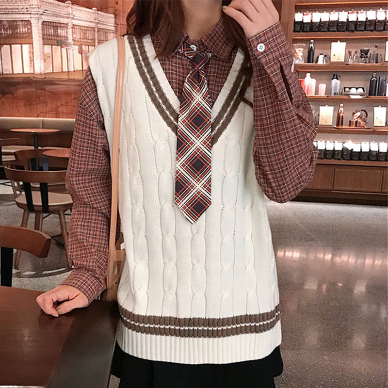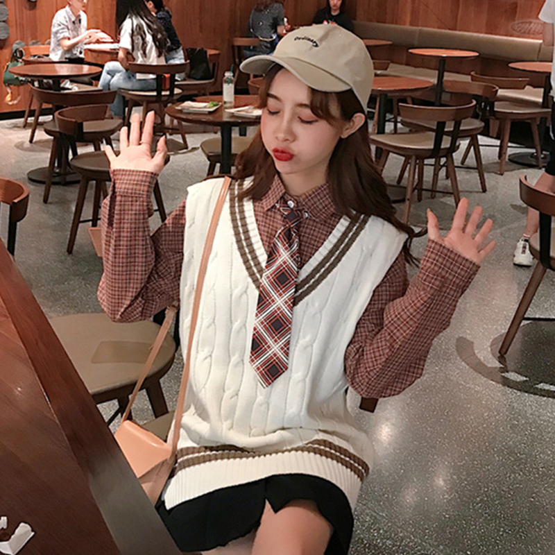 秋裝女2018新款學生針織背心無袖馬甲寬松格子襯衫中長款上衣套裝
