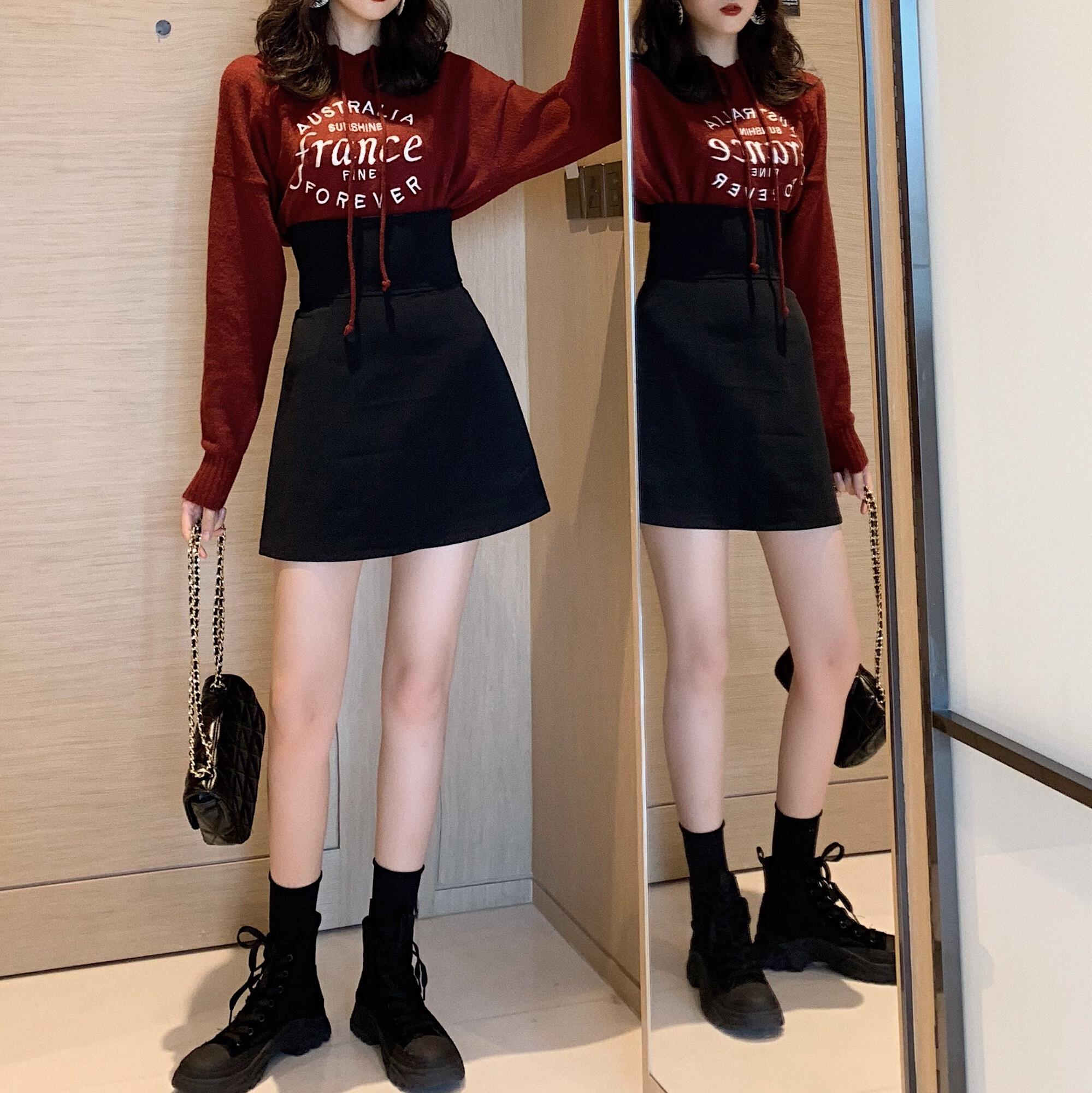 / 韓版寬松連帽字母套頭毛衣女秋冬2018新款+高腰包臀黑色半裙套裝