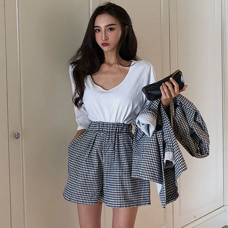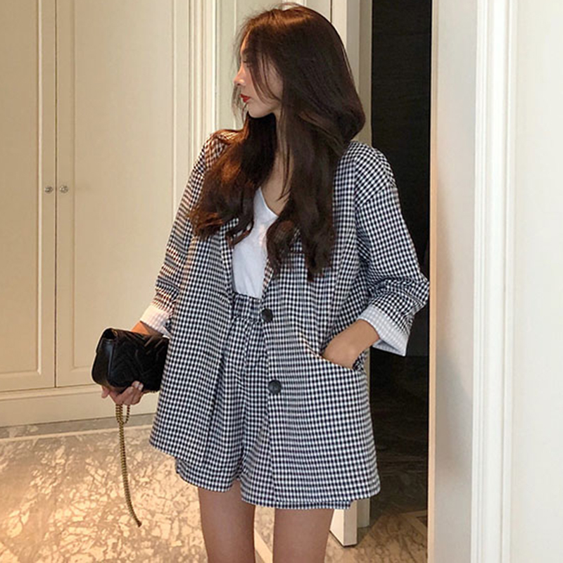 御姐套裝女秋冬新款復古風格子翻領西裝外套高腰顯瘦寬松闊腿短褲