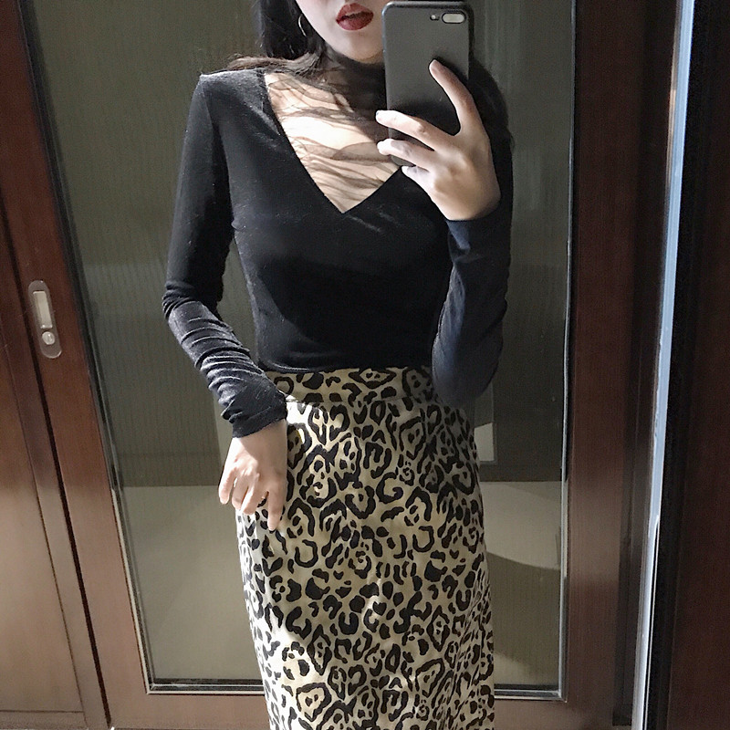 港味冬裝上衣女慵懶長袖t袖女韓版氣質V領網紗拼接修身絲絨Tee潮