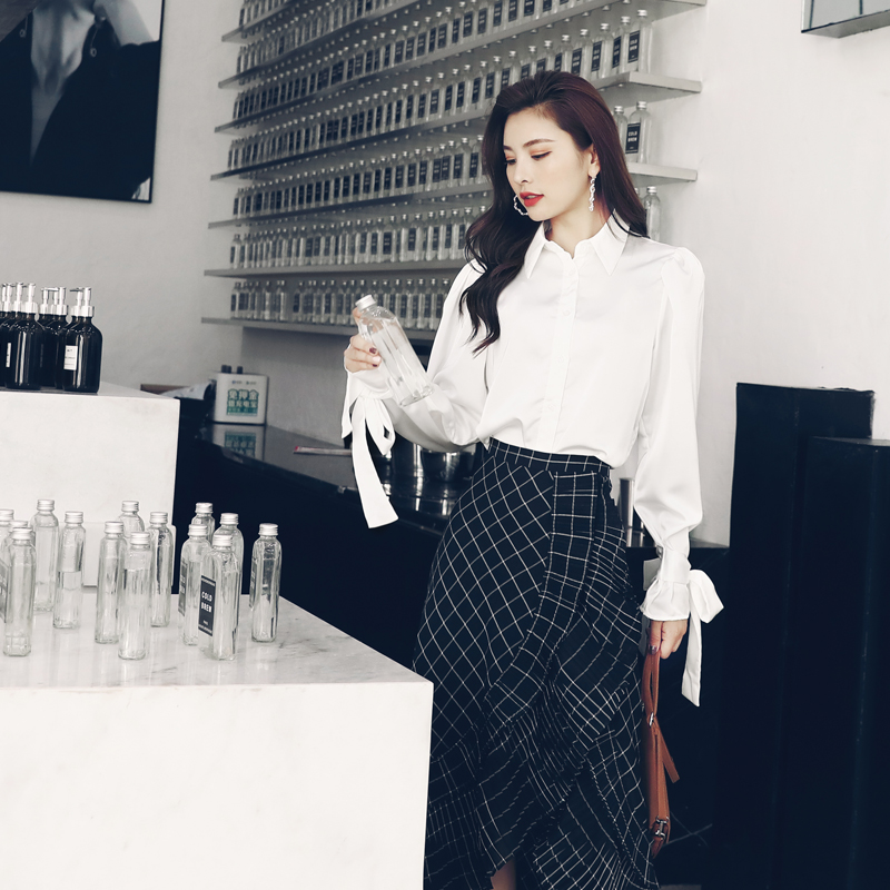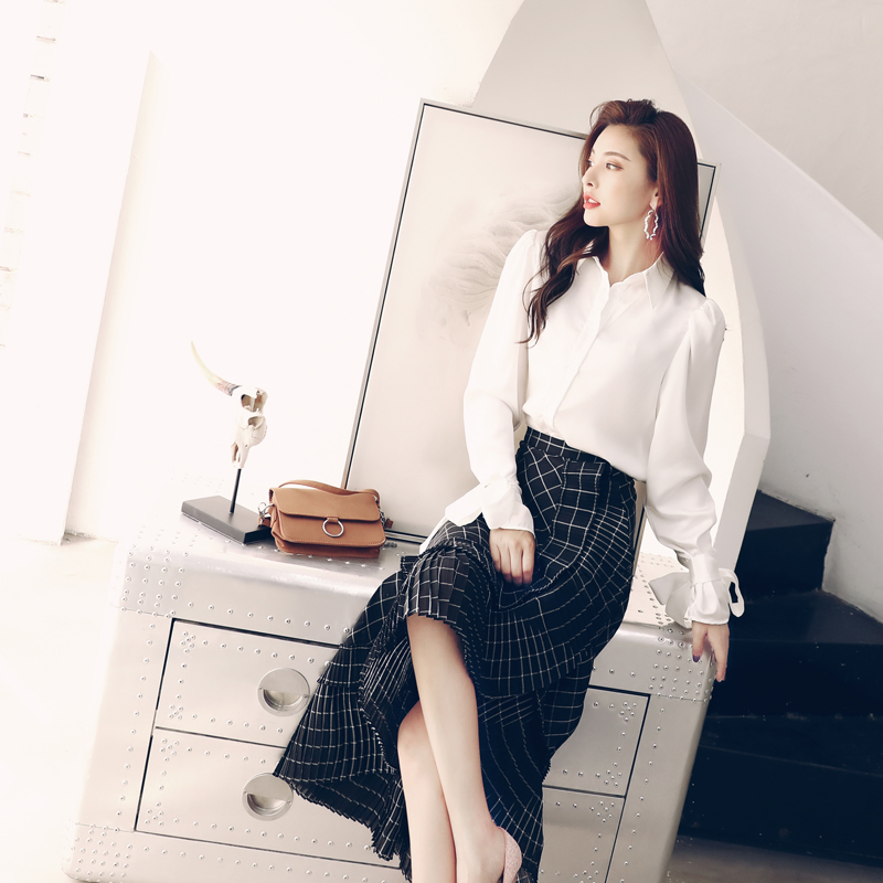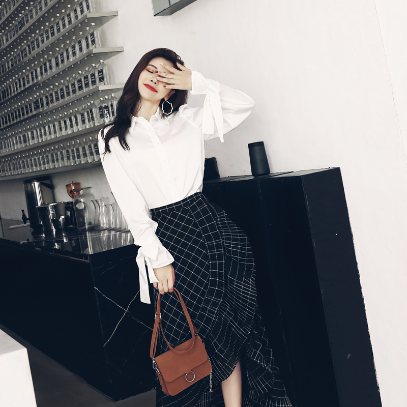 / 歐洲站時尚兩件套2018秋季長袖襯衫高腰格子不規則半身裙洋氣套裝