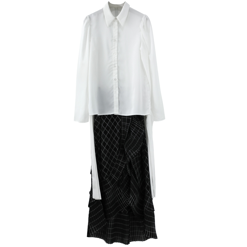 歐洲站時尚兩件套2018秋季長袖襯衫高腰格子不規則半身裙洋氣套裝