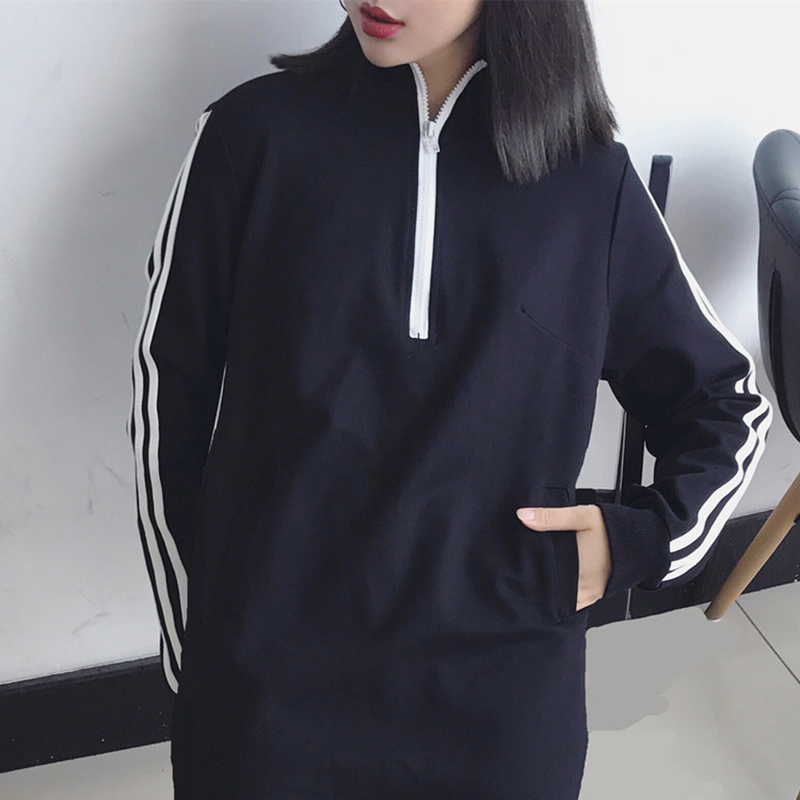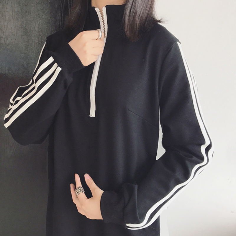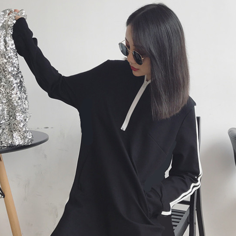 / 早秋2018新款韓版女裝學生寬松三條杠長袖衛衣休閑套頭長款連衣裙