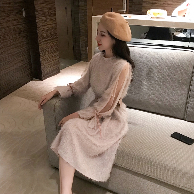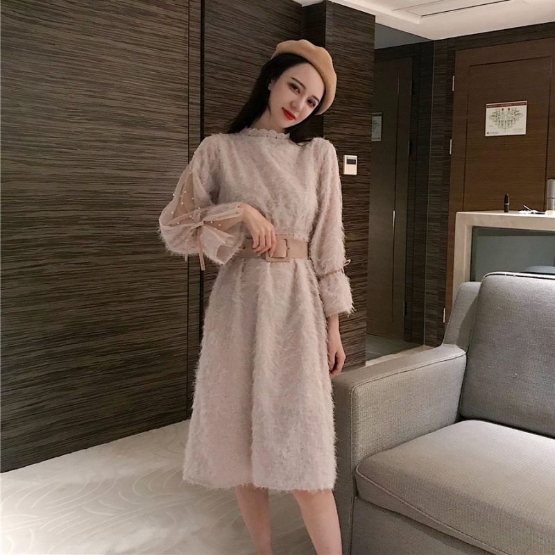 / 2018秋冬新款時尚花邊立領百搭中長款高腰蝴蝶結長袖毛毛連衣裙女