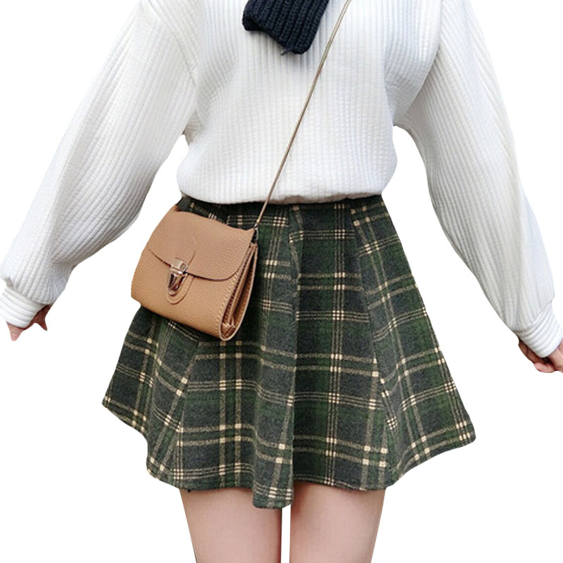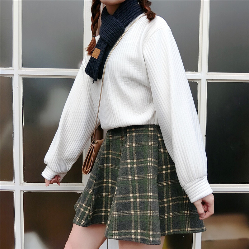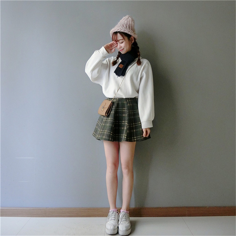/ 秋季韓版學院風chic修身彈力毛呢A字裙短裙復古高腰格子半身裙女