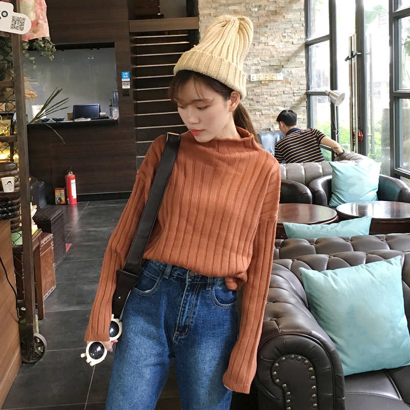 秋冬女裝韓版寬松慵懶風半高領坑條長袖套頭網紅針織衫毛衣上衣潮