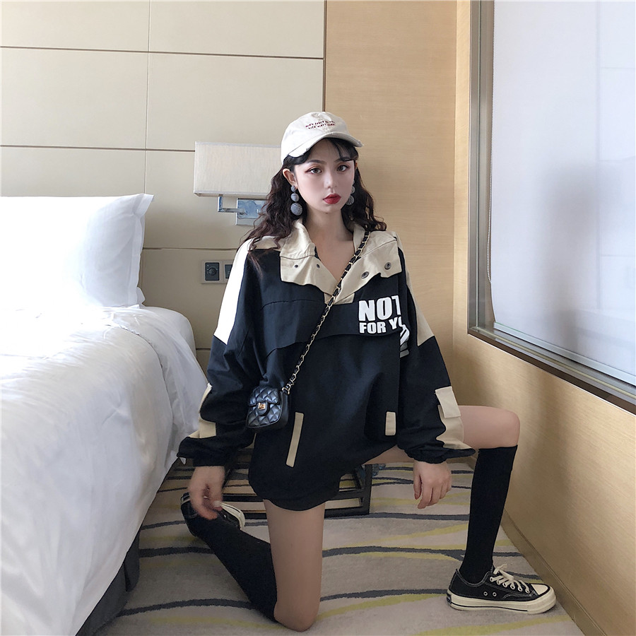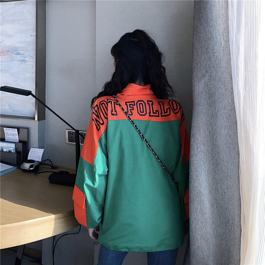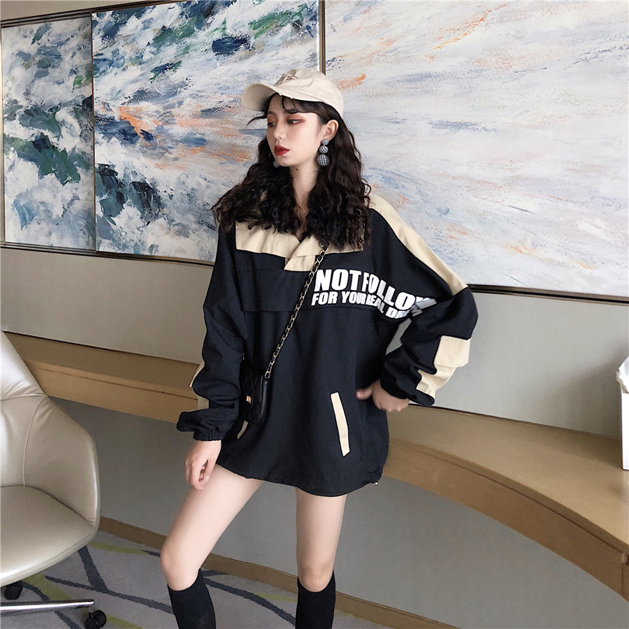 時尚chic外套女春秋2018新款韓版寬松字母套頭風衣百搭拼色外套潮