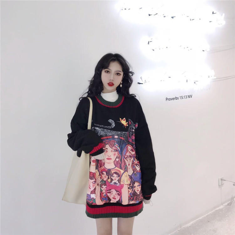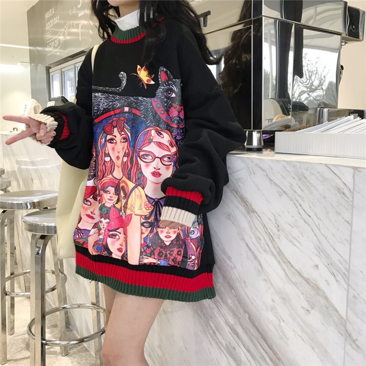/ 港味新款秋季chic上衣女個性繪畫印花寬松撞色中長款加絨套頭衛衣