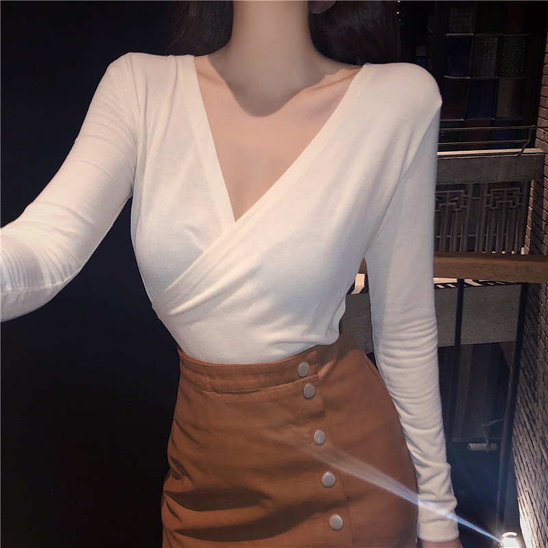 / 上衣女新款韓版秋季純色V領顯瘦復古chic氣質彈力百搭打底針織衫