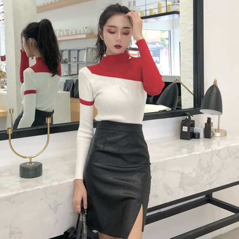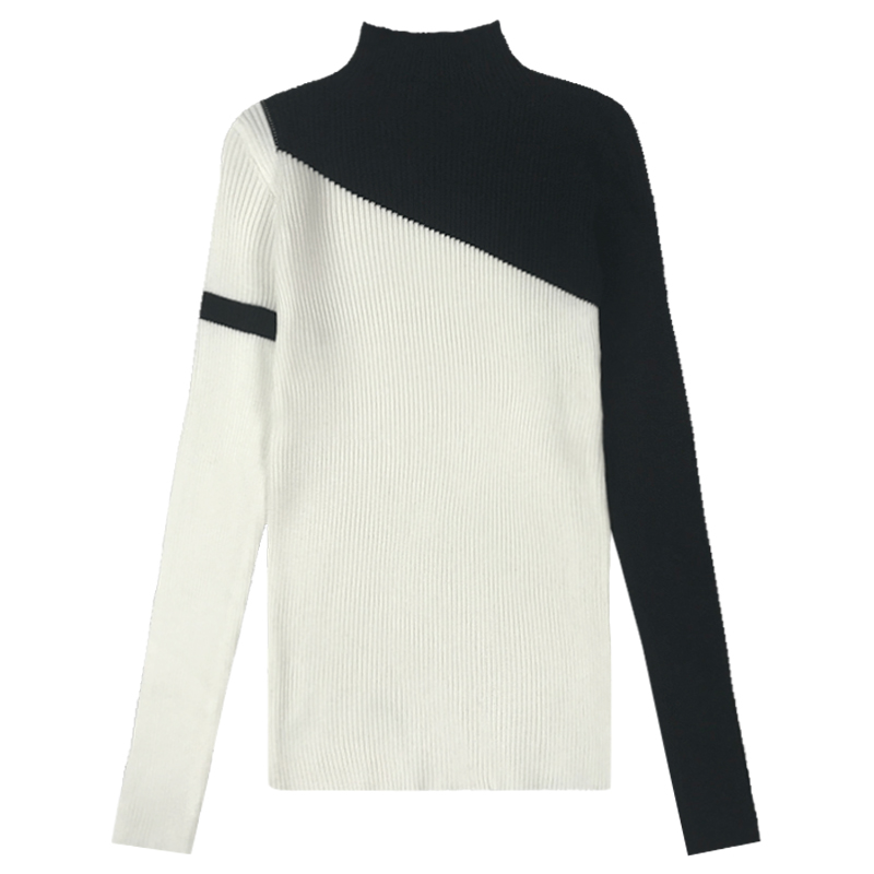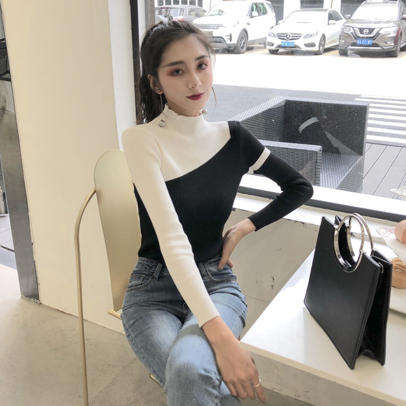 / 港風針織衫毛衣女秋裝2018新款修身條紋拼色半高領長袖打底上衣潮