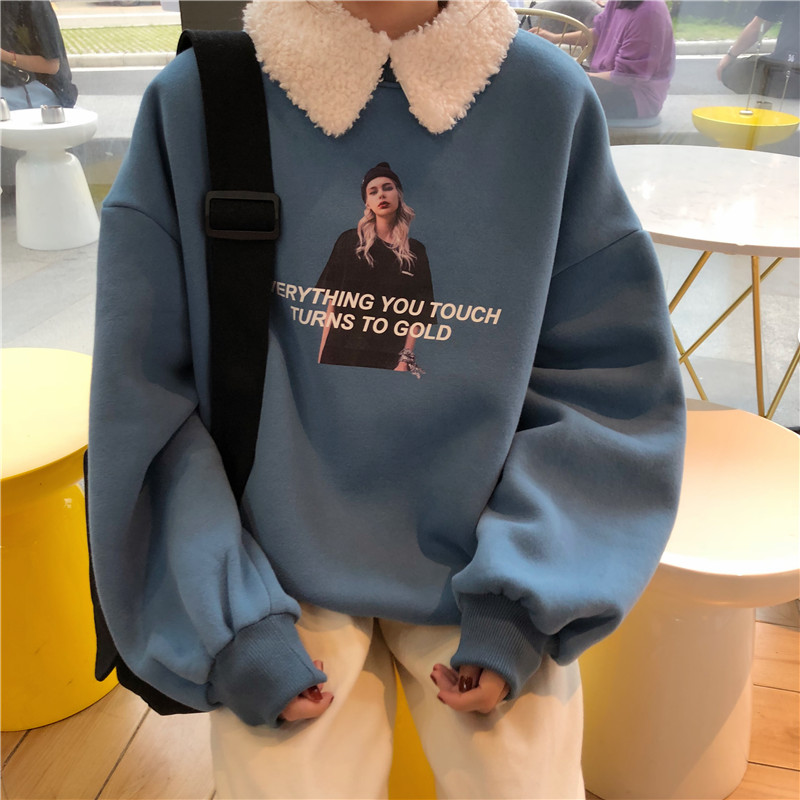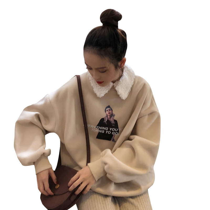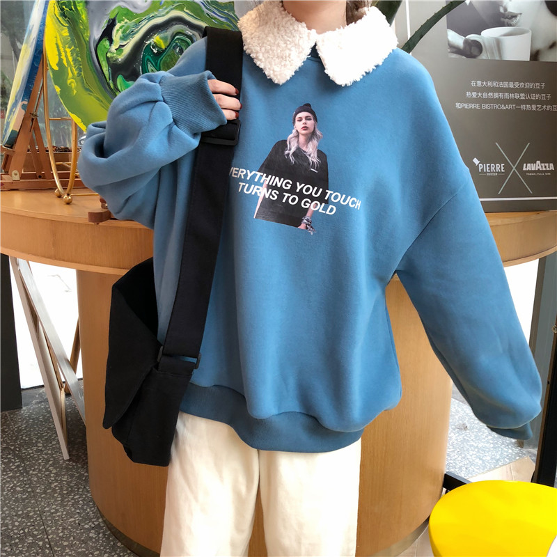 / 2018新款秋冬韓版寬松原宿風人物加絨加厚拼接仿羊羔毛衛衣外套女