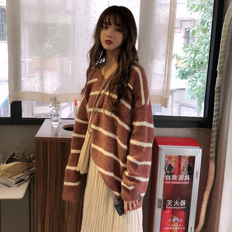 毛衣配裙子兩件套女秋冬新款寬松V領條紋毛衣高腰百褶A字半身裙子